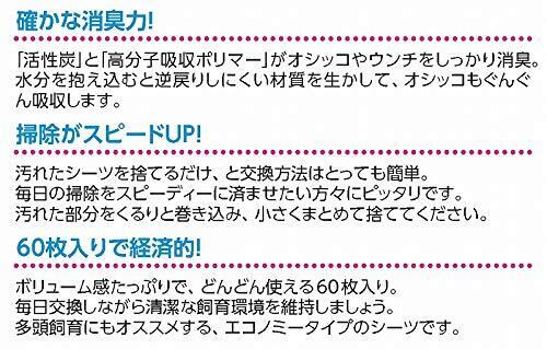 うさぎ用の消臭シーツです。広い「引き出しトレイ」から小さな「コーナートレイ」にまで使えます。薄くてコンパクトでも、確かな実力です。しっかり「消臭」「吸収」します。「活性炭」と「高分子吸収ポリマー」がオシッコやウンチをしっかり消臭します。水分を抱え込むと逆戻りしにくい素材です。汚れたらどんどん交換できる60枚入りです。汚れたシーツを捨てるだけ、と交換方法はとっても簡単なので、毎日の掃除をスピーディーに済ませたい方々にぴったりです。毎日交換して飼育環境を清潔に保つことができます。