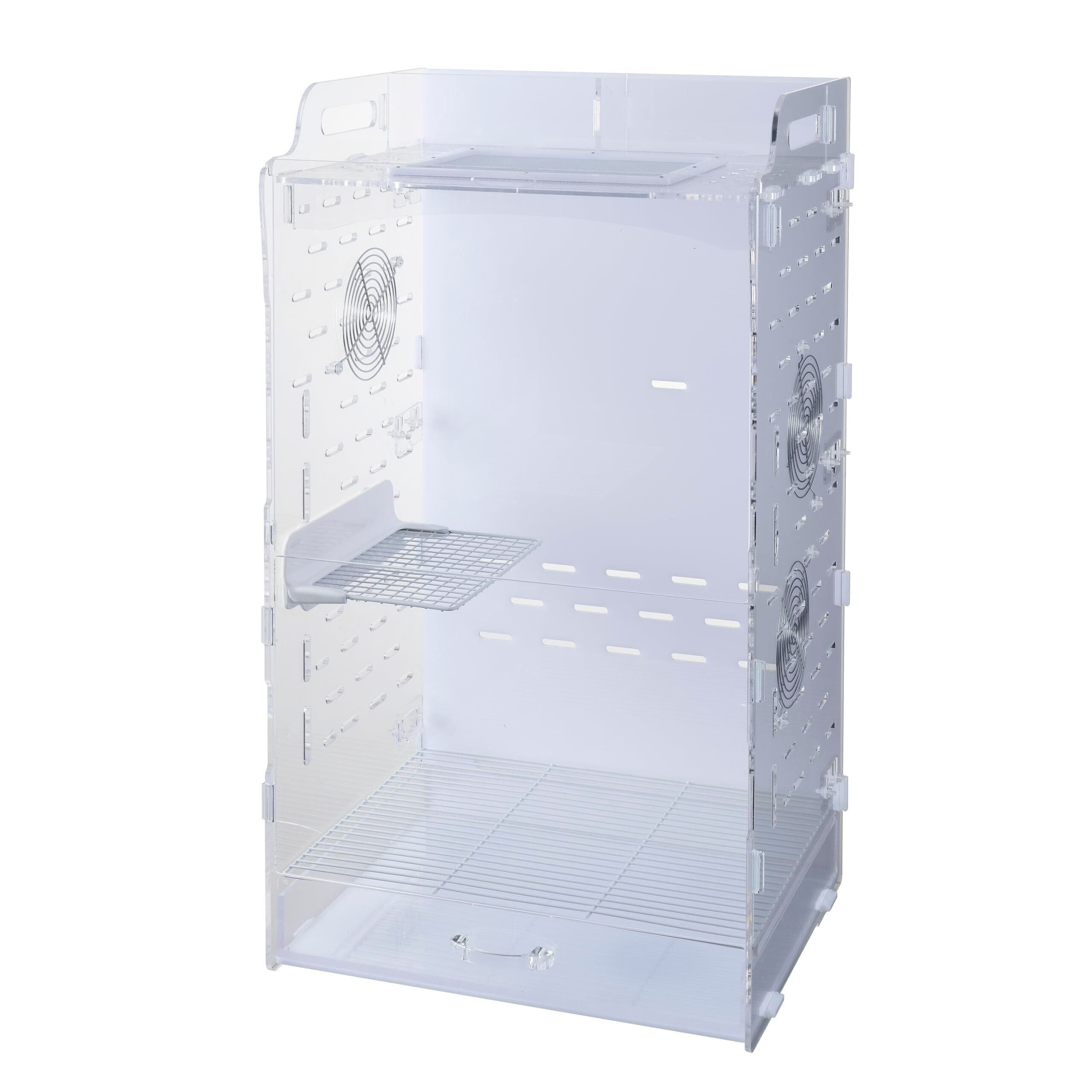 クリアでかわいい姿がよく見えるアクリル製ケージ 上下運動が得意なフクロモモンガ&デグーに最適!な専用ケージ。 自由に移動できるワイヤーネット、取外し簡単で洗いやすい金属メッシュステージ付。 ハーモニーホイール専用ホイールホルダー付。 遊具などを自由に設置できるフック受け付。 配線すっきり、左右6か所にコード穴。 自由に移動できるワイヤーネット付。 低い位置にもボトル設置が可能なので、ベビーでも水が飲みやすい。 天面のメッシュパネルには上部設置型ヒーターも設置可能。 大きく開く前面ドアと汚れがたまりにくく、お手入れしやすい引き出しトレイ&スノコでメンテナンスもラクラク。 組立簡単!パーツを差し込んでゴムリングで固定するだけ! アクリルケージだから気になる汚れもサッと拭ける。 アクリルケージだから冬でも高い保湿性。 アクリルケージだからニオイが外にもれにくい。 <組立時サイズ>約幅40.0×奥行き34.0×高さ71.0cm ※ヒーター・ホイール・給水器はセット内容に含まれておりません。必要に応じて別途お買い求めください。