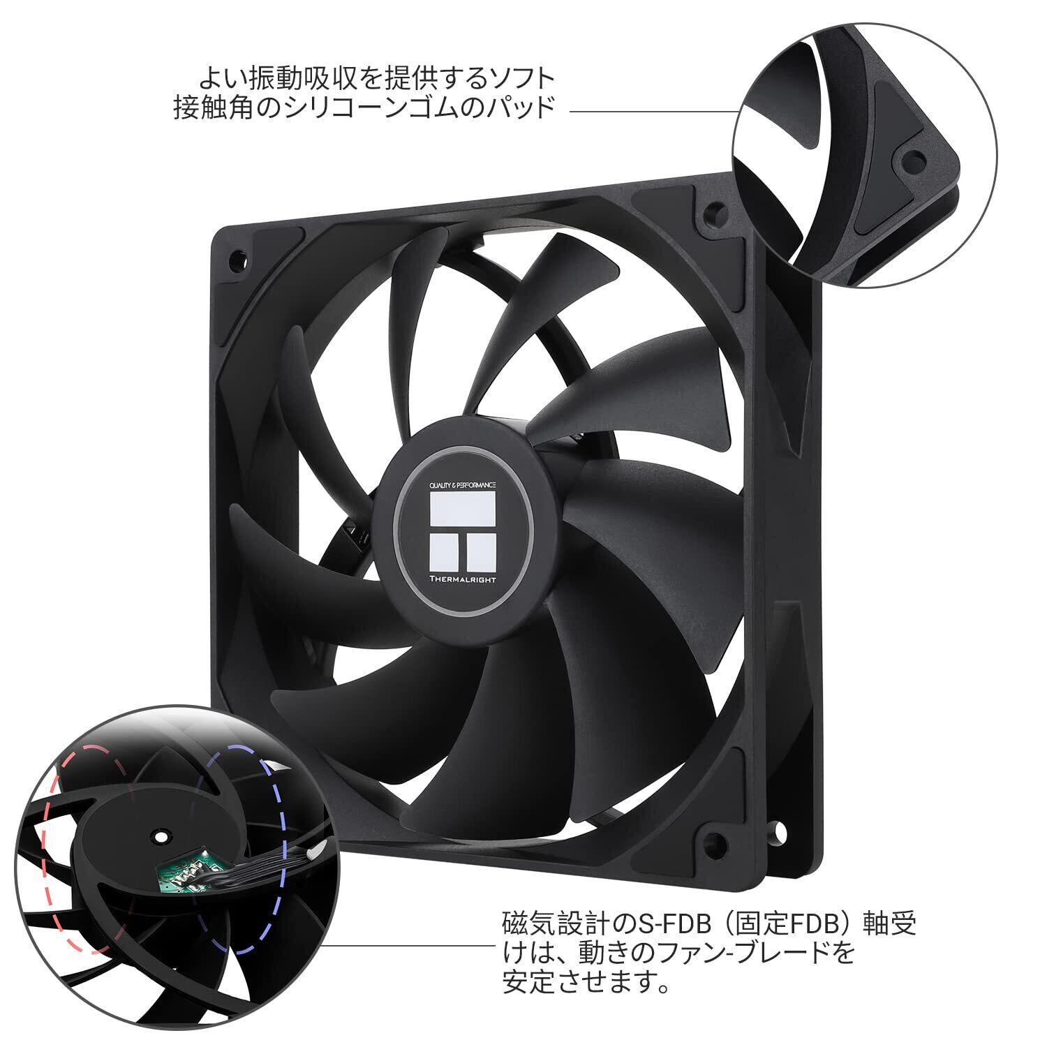 【振動低減と低騒音】を実現 ケースファンの四面には柔らかい素材のシリコンコーナーパッドが搭載され、ファンの回転による振動や摩擦を軽減でき、完璧に騒音を低減し、低騒音で冷却を行うことができます。