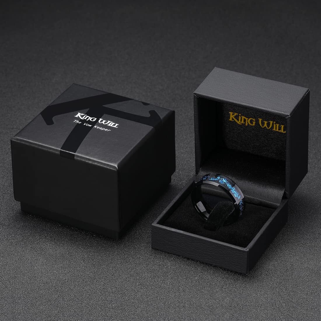 [King Will] メンズ リング タングステン 指輪 幅 8mm ブラック 結婚指輪 ブルーフォイルインレイ サイズ 19