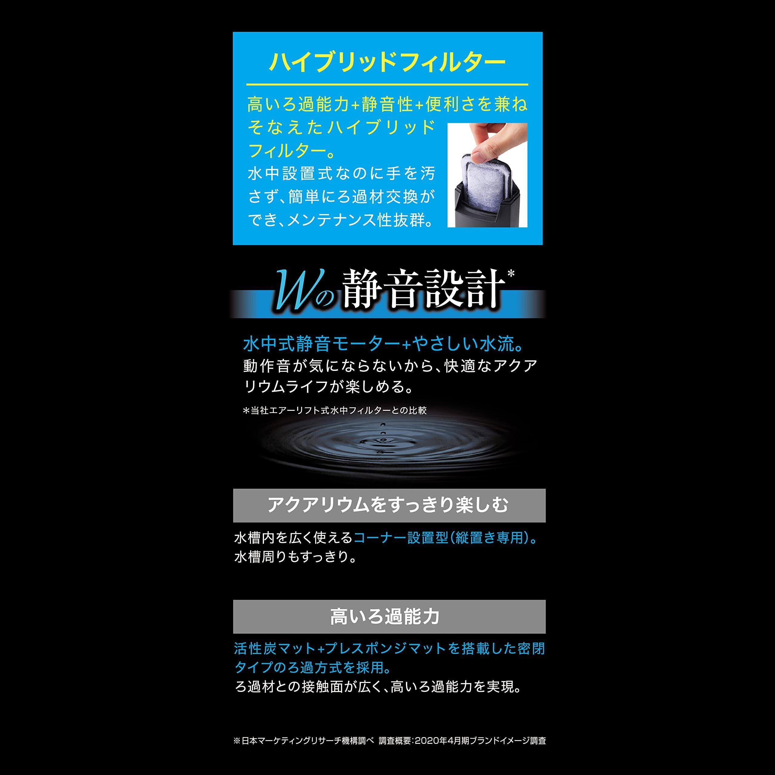 動作音と水流がWで静かなハイブリッドフィルター。水槽周りもスッキリ。目立ちにくいブラックカラー。水槽との隙間をふさぐ、侵入防止スポンジ付き。高いろ過能力+静音性+便利さを兼ねそなえたハイブリッドフィルター。水中設置式なのに手を汚さず、簡単にろ過材交換ができ、メンテナンス性抜群。水中式静音モーター+やさしい水流のWの静音。動作音が気にならないから、快適なアクアリウムライフが楽しめます。水槽内を広く使えるコーナー設置型(縦置き専用)。水槽周りもすっきり。活性炭マット+プレスポンジマットを搭載した密閉タイプのろ過方式を採用。ろ過材との接触面が広く、高いろ過能力を実現。