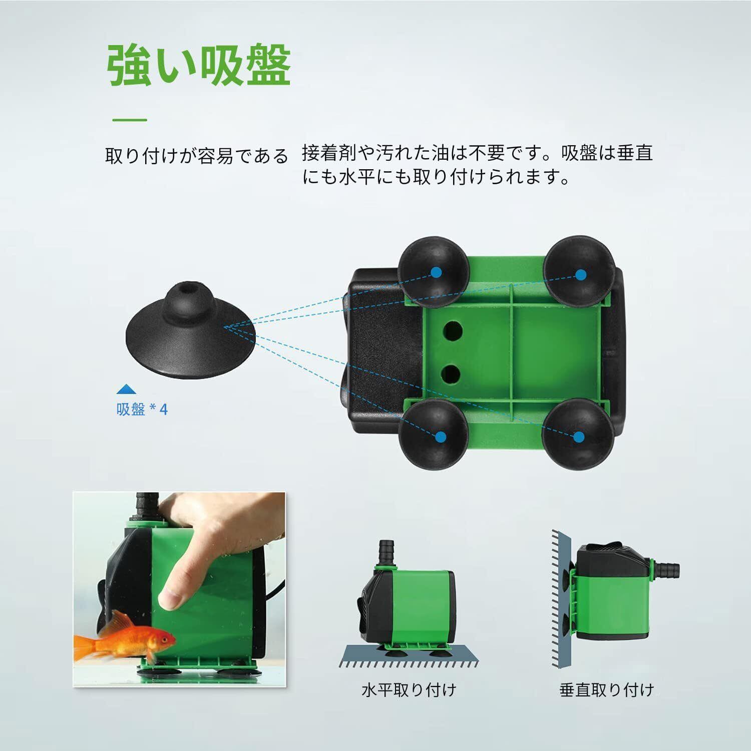 強い吸盤:水中ポンプには強力吸盤が付いて、台座に置き、または斜め・垂直の表面に貼るのもいいです。そして、手で回って位置を調整できます。どこにも置きやすくて、もっと使うことは便利です。