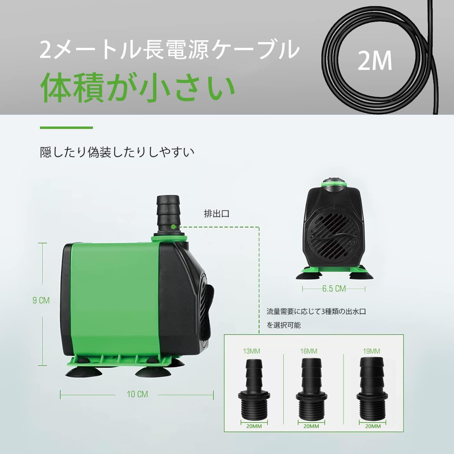 仕様:入力電圧:AC 110V/60Hz。電力:24W。電源コードの長さ:2M。最大揚程:3M。吐き出し口外径:13mm&16mm&19mm。最大吐出量:3000L/H(800 GPH)。騒音レベル:40デシベル以下 作業温度:32℉~104℉