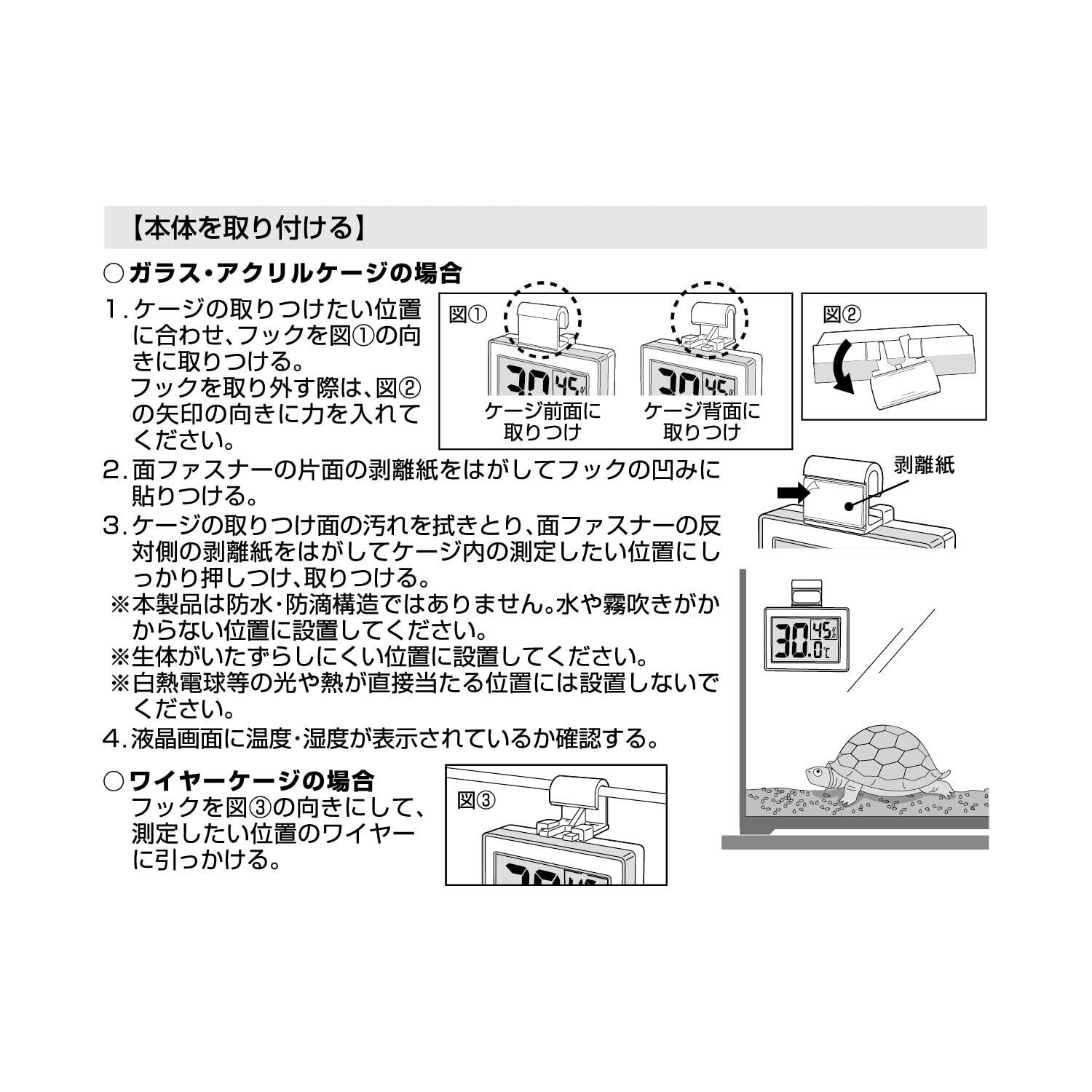 取り付け3WAYで使いやすい、コンパクトなコードレスデジタル温湿度計 ●ケージ前面、ケージ背面、ワイヤーケージと取り付け方が選べる3WAY ●コードレスでケージ周りすっきり! 温度測定範囲:0~50度 湿度測定範囲:20~90% 製品サイズ:約幅5.3×奥行2.0×高さ5.0cm(ケージ前面設置時) 付属品:ボタン電池(LR44)、面ファスナー、電池フタ固定ネジ
