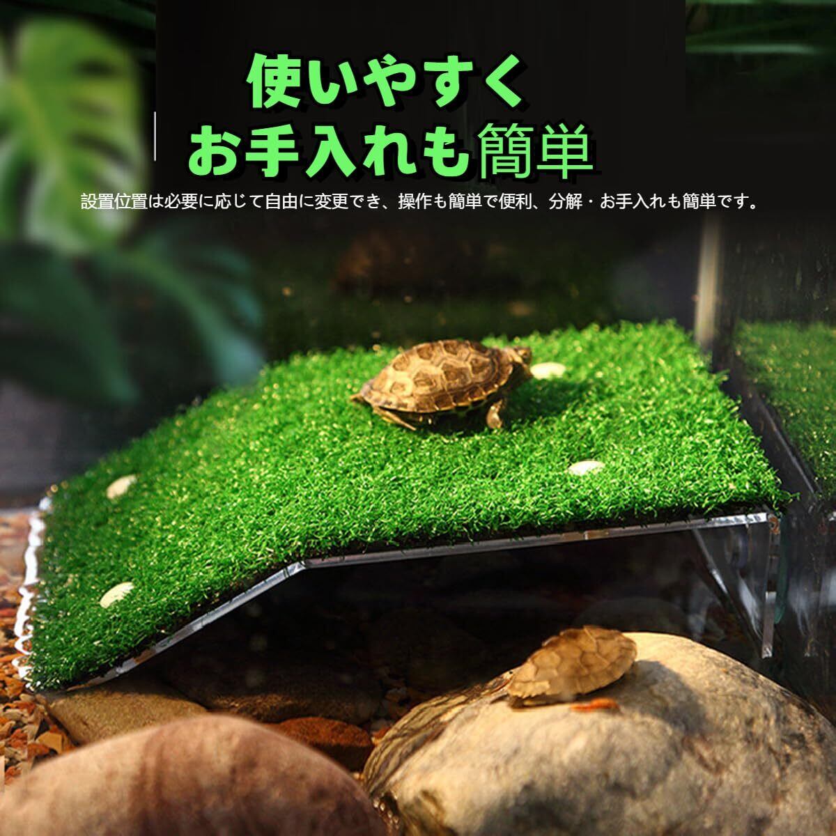 【清掃が簡単】人工芝素材は洗浄が容易で速乾性があり、水で洗い流すか湿った布で拭くだけで簡単に清潔を保つことができます。亀に自然な住処感を提供し、快適な環境で自由に爬行や休息を楽しむことができます。