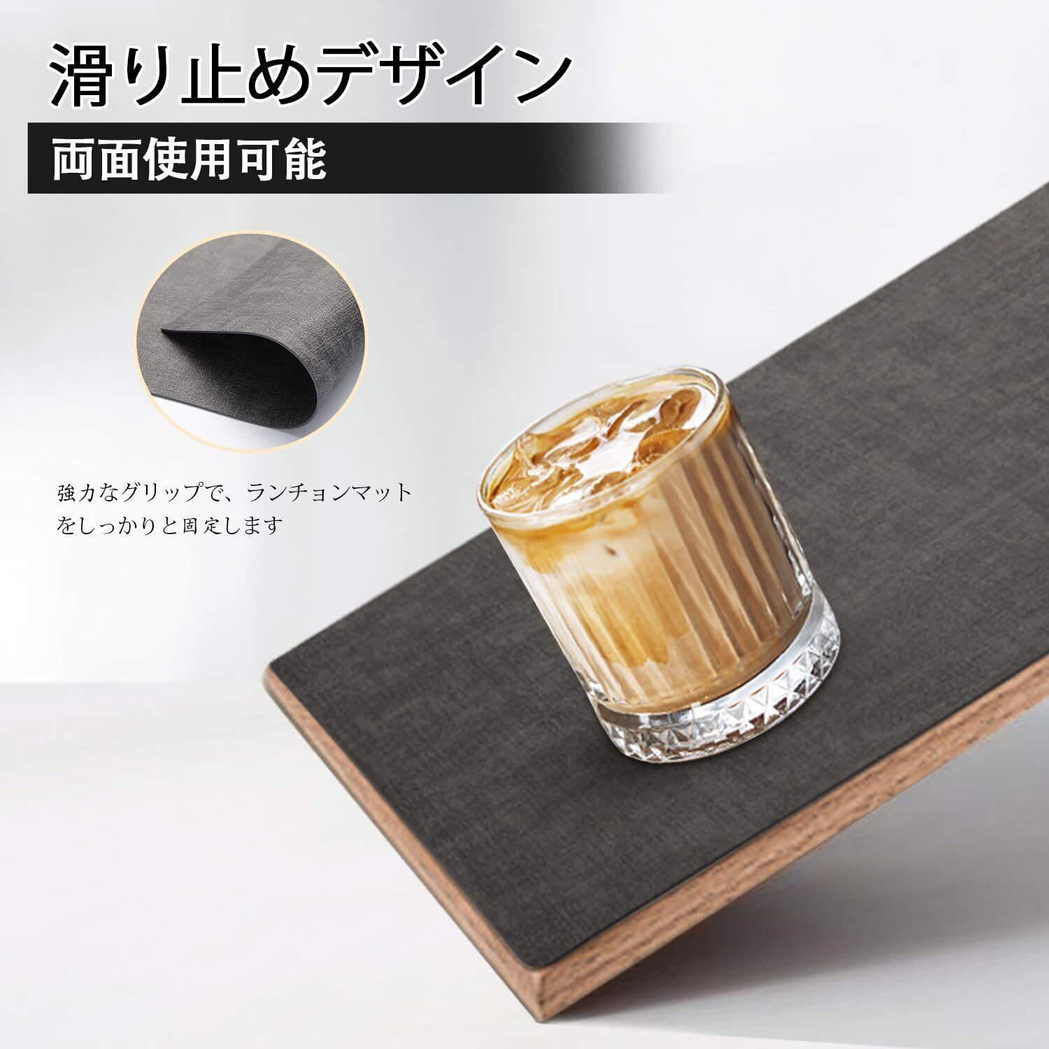 【素材】高級感のある PUレザーを採用。PUレザーは撥水・防カビのため取り扱いやすく、安価な素材であるPVCレザーよりも柔軟性に優れてます。耐熱温度は80°Cに達して、テーブルを傷付けなくしっかり保護できます。