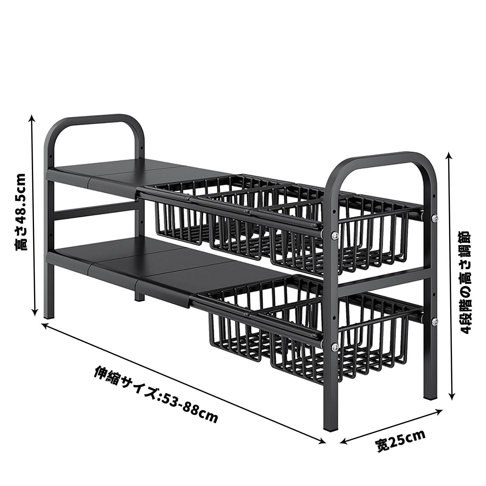 製品仕様:幅53-88×奥行25×高さ44cm、収納バスケット:26×16.5×7cm、シンク下伸縮棚は変形しない厚手の素材でできており、丈夫で耐久性があります。キッチン、バスルーム、シンク下、ワードローブなど、あらゆる場所に適しています。鍋やフライパンなどの重いものを収納することができ、変形することなく安全でしっかりしています。