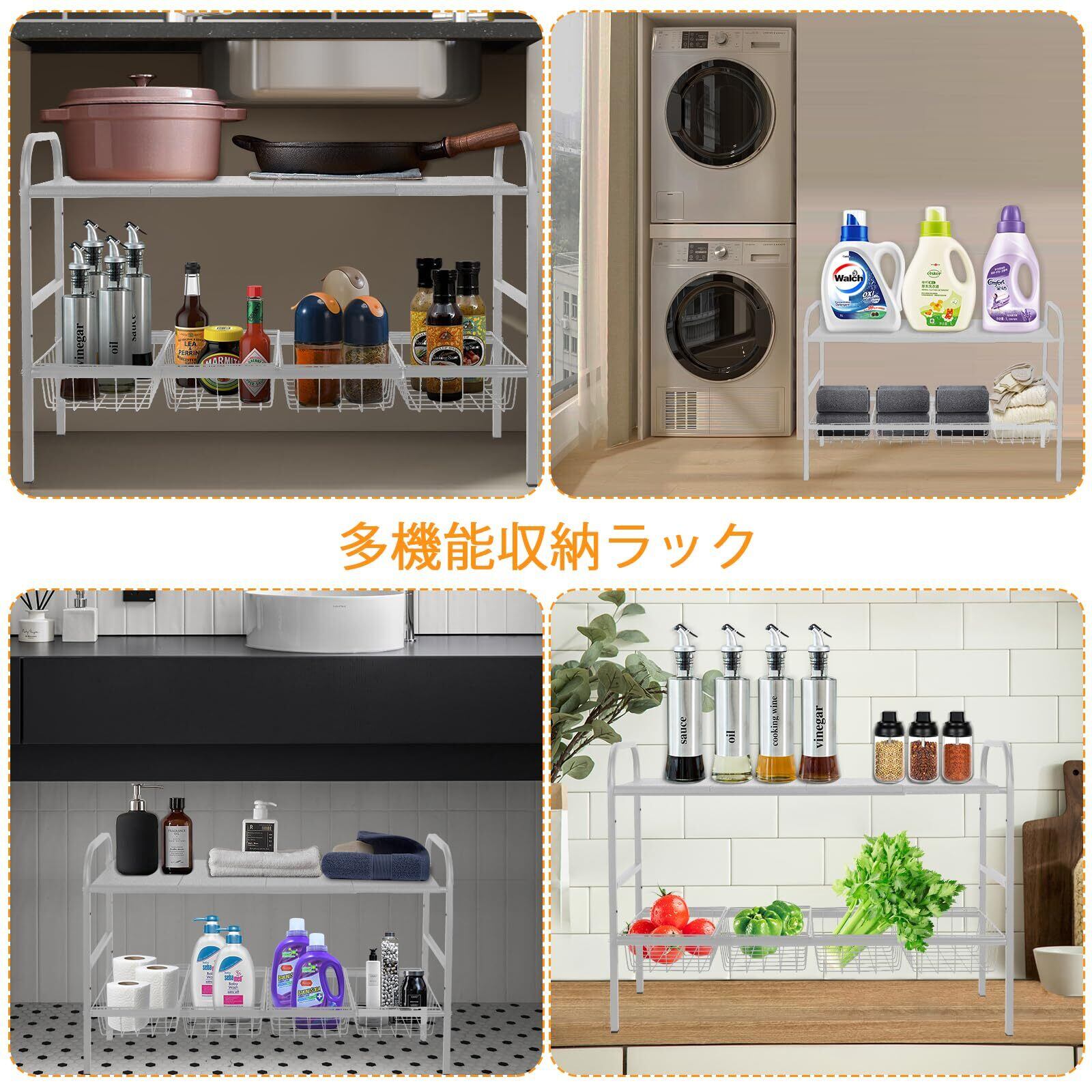 シンク下収納ラック, 洗面台下収納 洗面台下収納 伸縮式, 2段収納 キッチン収納ラック 組み立て簡単 省スペース 収納バスケット5個付き (ホワイト)