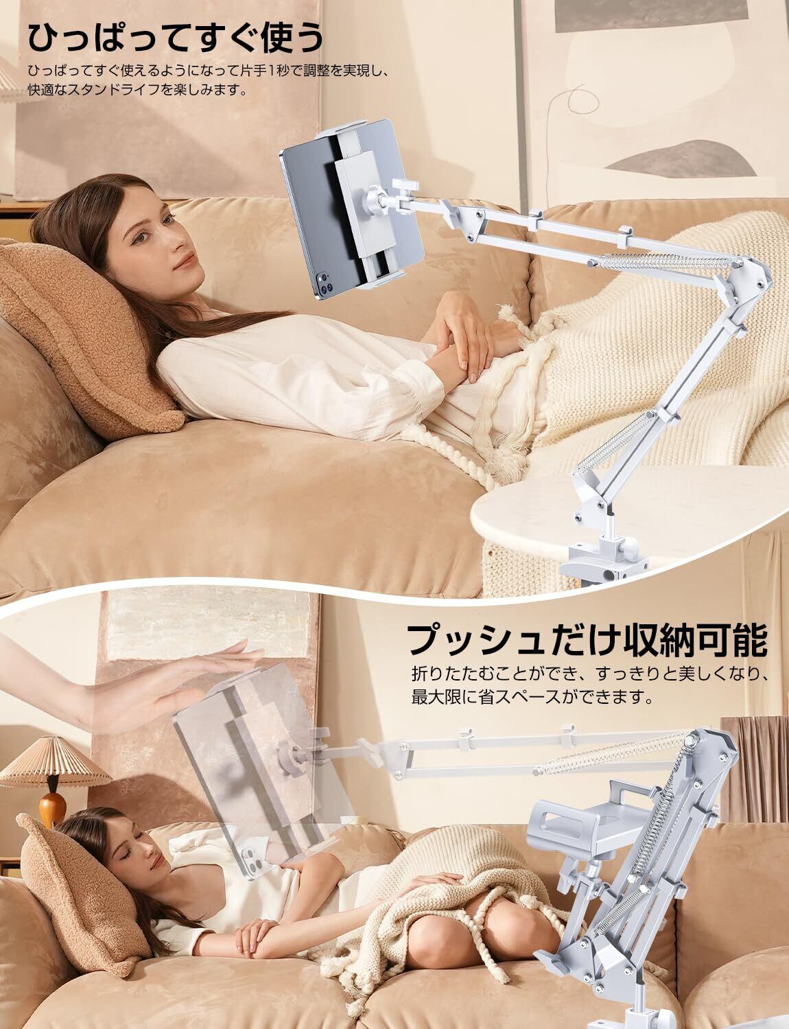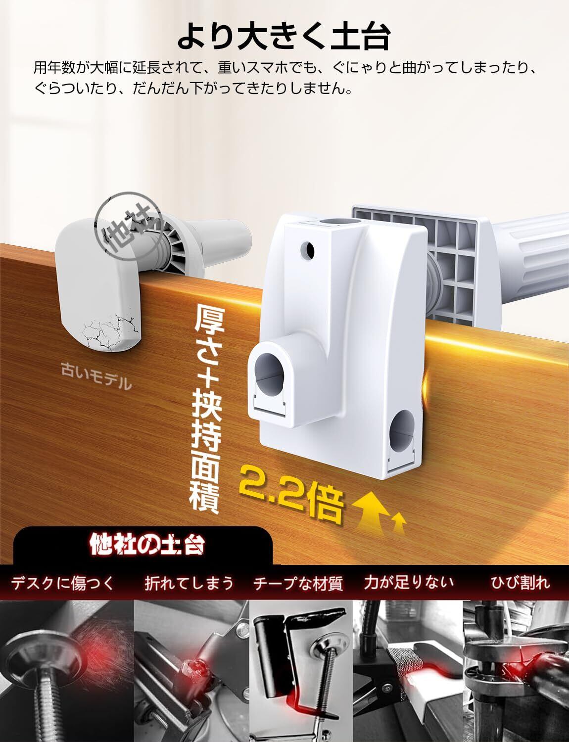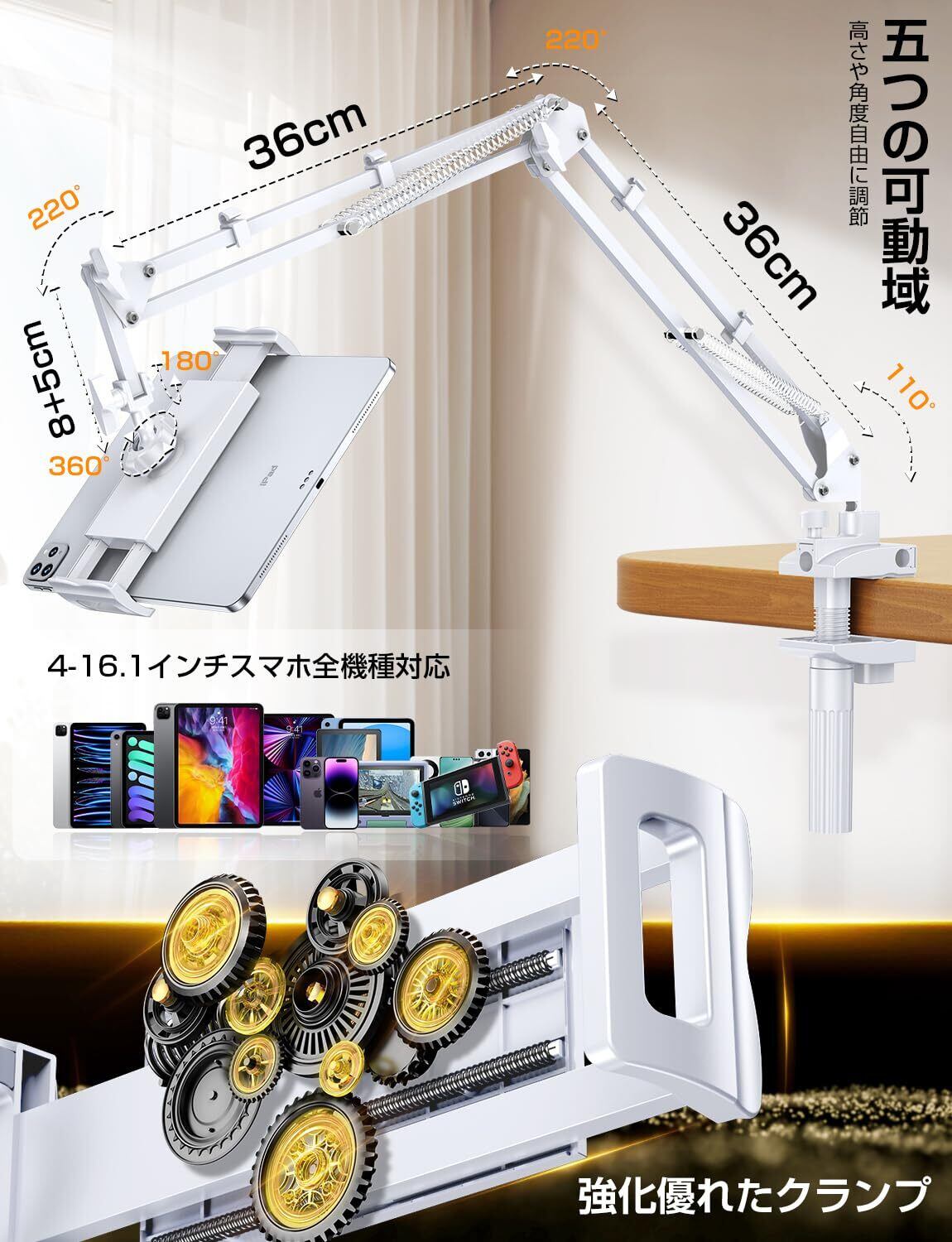 タブレット スタンド【5穴✙五つの可動軸】ipad アーム スマホスタンド 寝ながら スマホアームスタンド 寝ながらタブレットスタンド 携帯 すまほ けいたい フレキシブル ケーブルクリップ付き 土台強化 安定性 360° 回転 5穴土台 碳素スチール製 4-12.9インチ