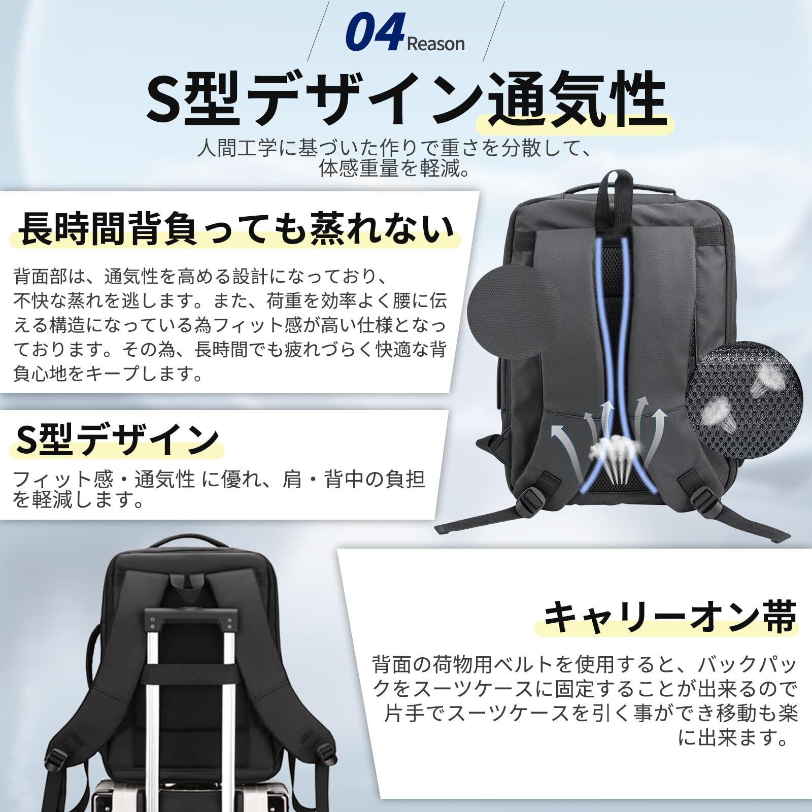 【便利な3 WAY】ショルダーベルトの太さが適切で、クッション性のある通気メッシュ素材を採用し、両肩の負担を軽減し、気楽に体に背負うことができます。ショルダーベルトの長さは調節でき、身長や性別の異なるお客様に適しています。また、三角形の二重縫いの技術を採用し、より良い耐荷重能力を備えており、断裂することの心配はありません。3WAY仕様(リュック、横手提げ、縦手提げタイプ)、お客様やビジネスパートナーの前でリュックを取り外すと安心できます。さらに重要なのは、出張旅行用のスーツケースに掛けることができる専用キャリーオン帯も付いています。