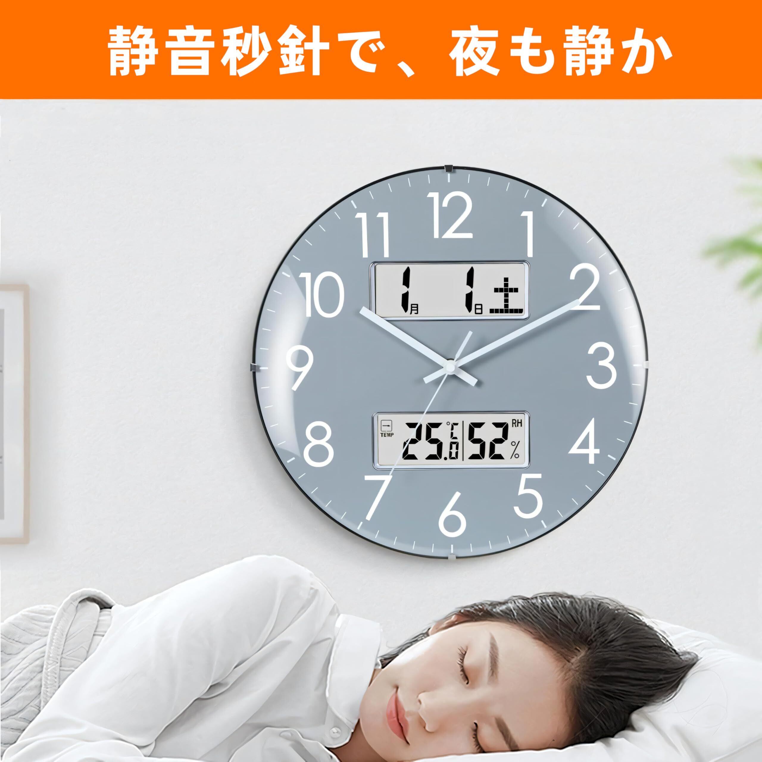 挂け時計 温度・湿度・日付・曜日表示 33cm直径 アナログ 静音 連続秒針 球面ガラス グレー
