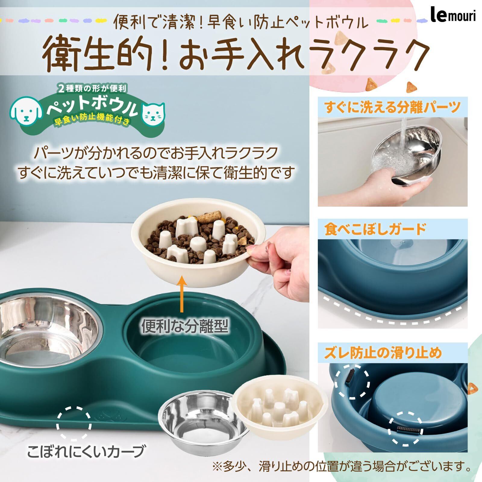 【愛玩動物看護師推奨】lemouri 早食い防止食器 食いこぼし防止 衛生的 滑り止め付き 取り外し式 猫 犬 餌 ペット健康維持 食器洗いOK ご飯台 餌台 (グリーン)