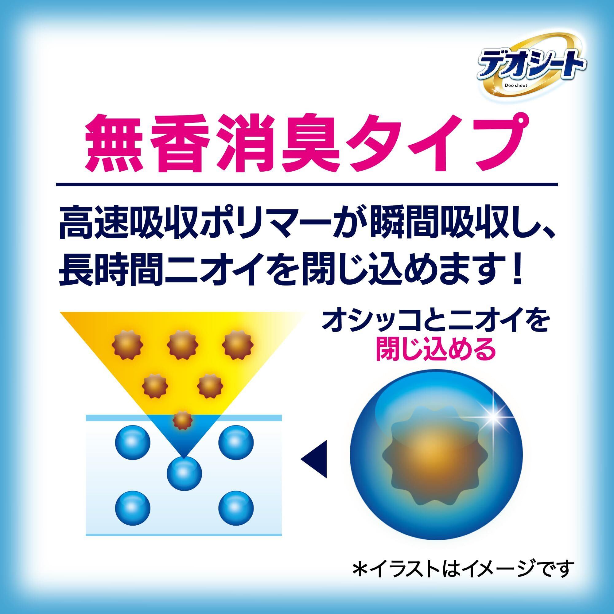 デオシート独自の瞬速とじこめ吸収体がオシッコを瞬間吸収して、表面サラサラ&オシッコ広がりが小さいペットシートです。高速吸収ポリマーがオシッコを瞬間吸収して長時間ニオイを閉じ込める無香消臭タイプ。オシッコ5回分(約150cc)をしっかり超吸収。※小型犬の平均オシッコ量から算出。シートサイズ:44×32cm(トレーにぴったり)