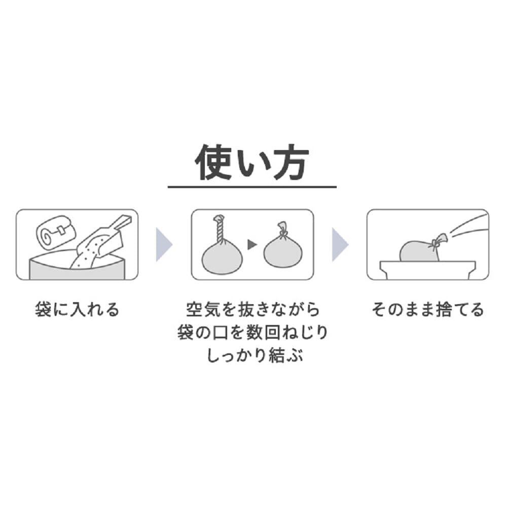 袋に入れたら口を結び、燃えるゴミとして処理してください。(※一部の猫砂は燃えるゴミとして、廃棄出来ない場合がございます。廃棄の際は各自治体の取り決めに基づいた処理をお願いします。)
