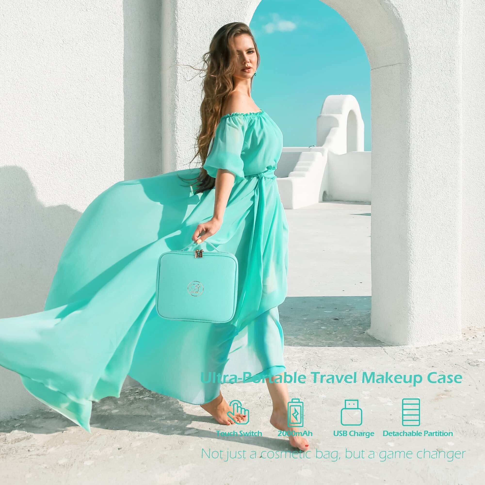 MOMIRA 鏡付きメイクボックス 化粧品収納ボックス コスメボックス 化粧ケース 調節可能な仕切り付き 3色調節可能なLEDライト メイクブラシケース付き 手持ち 大容量 自立式 プロ用 持ち運び 旅行 - アクアブルー