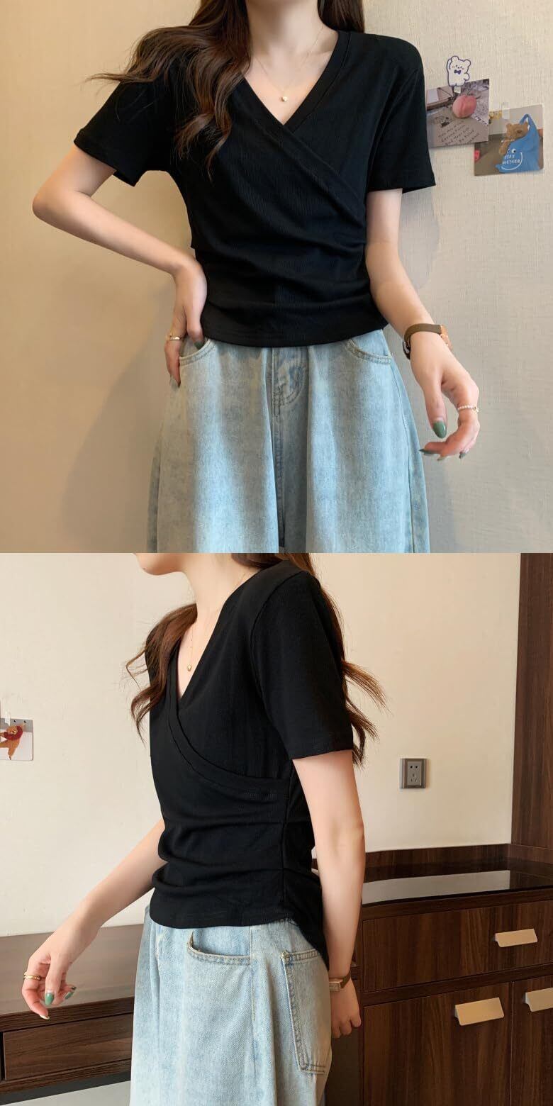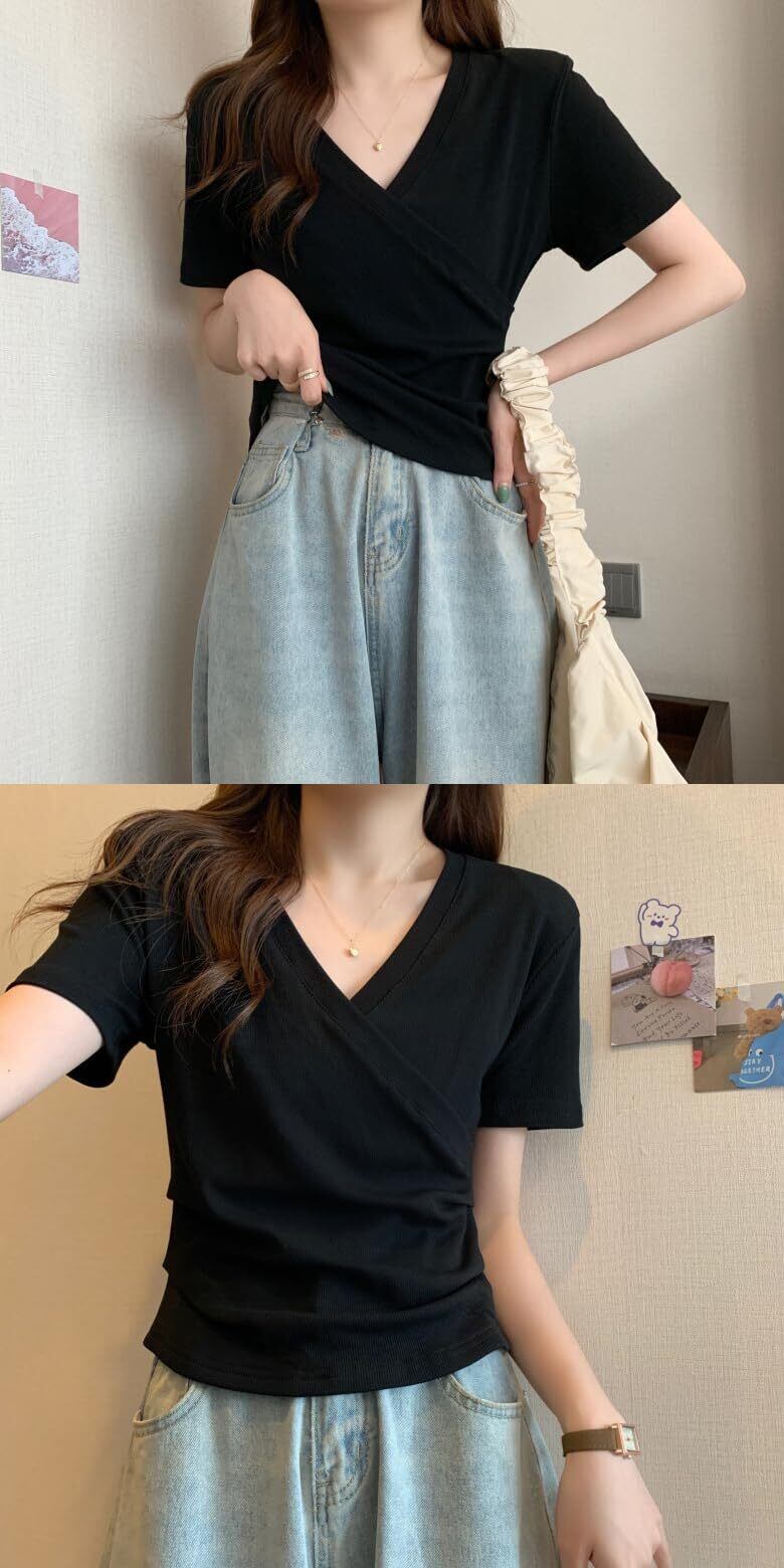 [YUUCDD] レディース Vネック Tシャツ 半袖 tシャツ カットソー トップス ストレッチ 無地 カジュアル おしゃれ