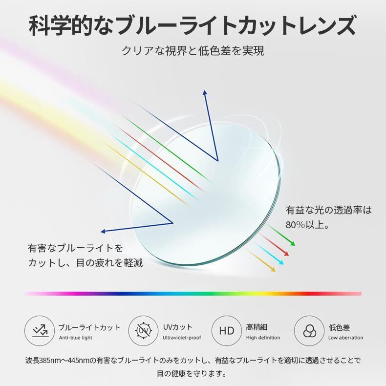 【超軽量・TR90素材による快適なフィット感 】 重さ14gと軽量で、とにかく軽い。軽いだけじゃなく、しなやかで壊れにくい。おしゃれにデザインされているパソコン用メガネです。日本人の顔幅に合わせて設計されており、ぴったりフィットするので快適につけられますよ。フレームが柔軟性に長けているため、顔にやさしくフィットします。レンズにほとんど色がついていないため、色が濁らずクリアな視界を保てるのが魅力。