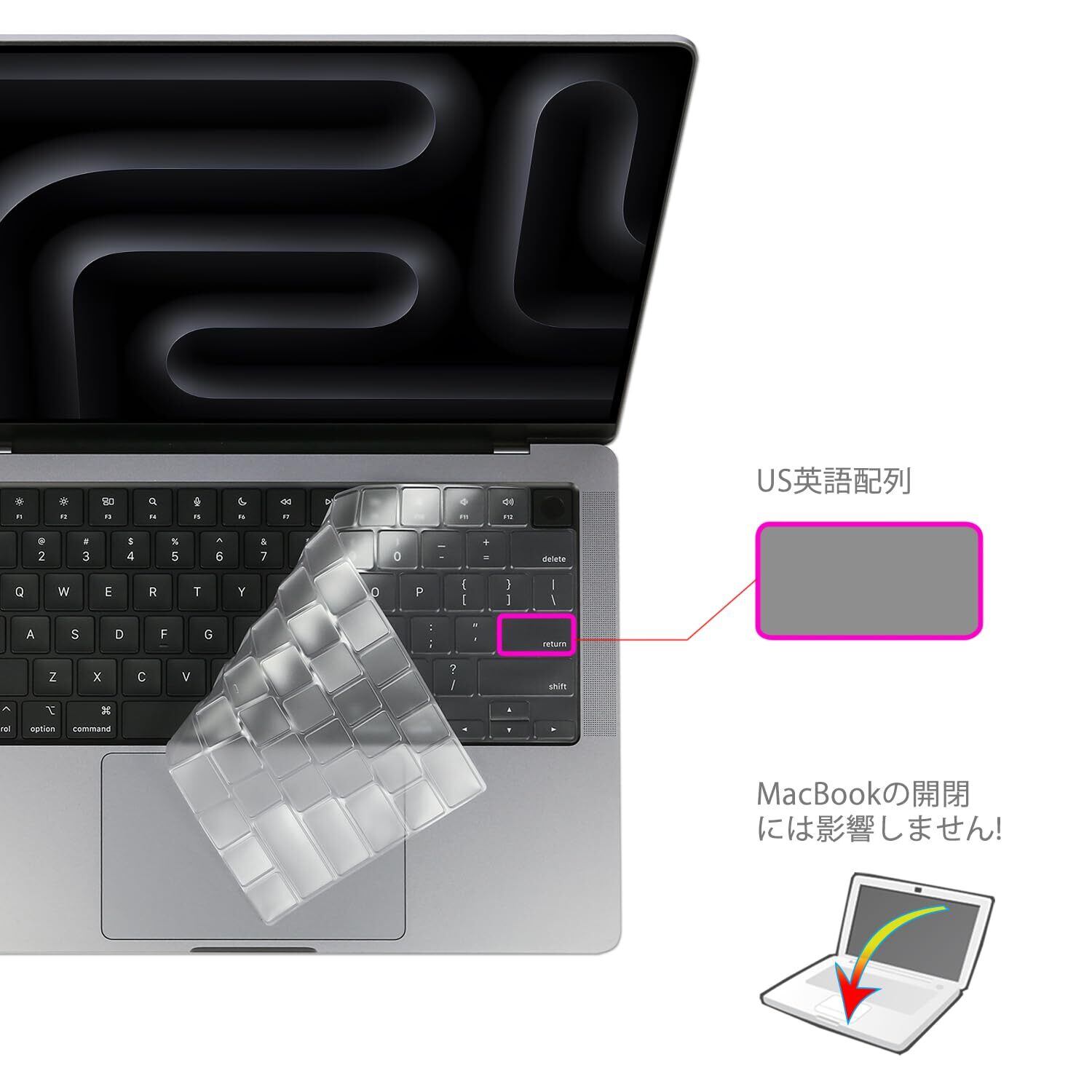 【対応機種】2025~2021発売MacBook Pro 14/ Pro 16 (M5 M4 M3 M2 M1 Pro Maxチップ)-A3434 A3112 A3401 A3185 A3403 A3186 A2992 A2918 A2991 A2779 A2780 A2442 A2485、2025~2022発売新型MacBook Air 13.6/ Air 15 (M4 M3 M2 Pro Maxチップ)-A3240 A3241 A3113 A3114 A2941 A2681 専用に設計される英語US配列キーボード カバーです。