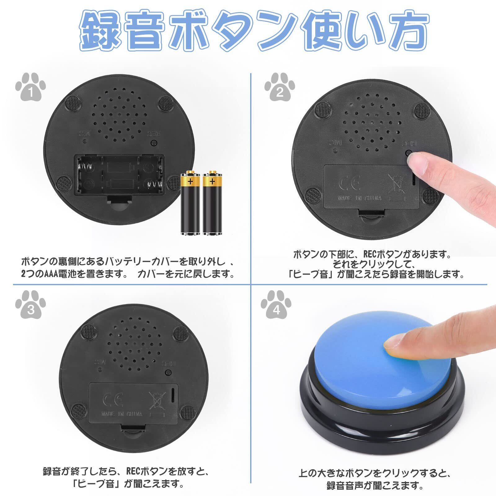 [録音可能なボタン] - ペットボタンの会話コミュニケーション用に設計されたドッグボタンは、音声をクリアに録音し、スムーズに再生できます。 合計録音時間は最大 30 秒です。 「肉」、「水」、「出て!」、「含めて」などの個別に記録されたコマンドは、ペットの発話をサポートします。 短いサイレンサーで気になる音を録音し、再生ボタンを押していつでも録音した音を変更できます。 犬 会話ボタン 日本語の取扱説明書が付いているので、初心者でもペットに使い方を簡単に教えることができます。