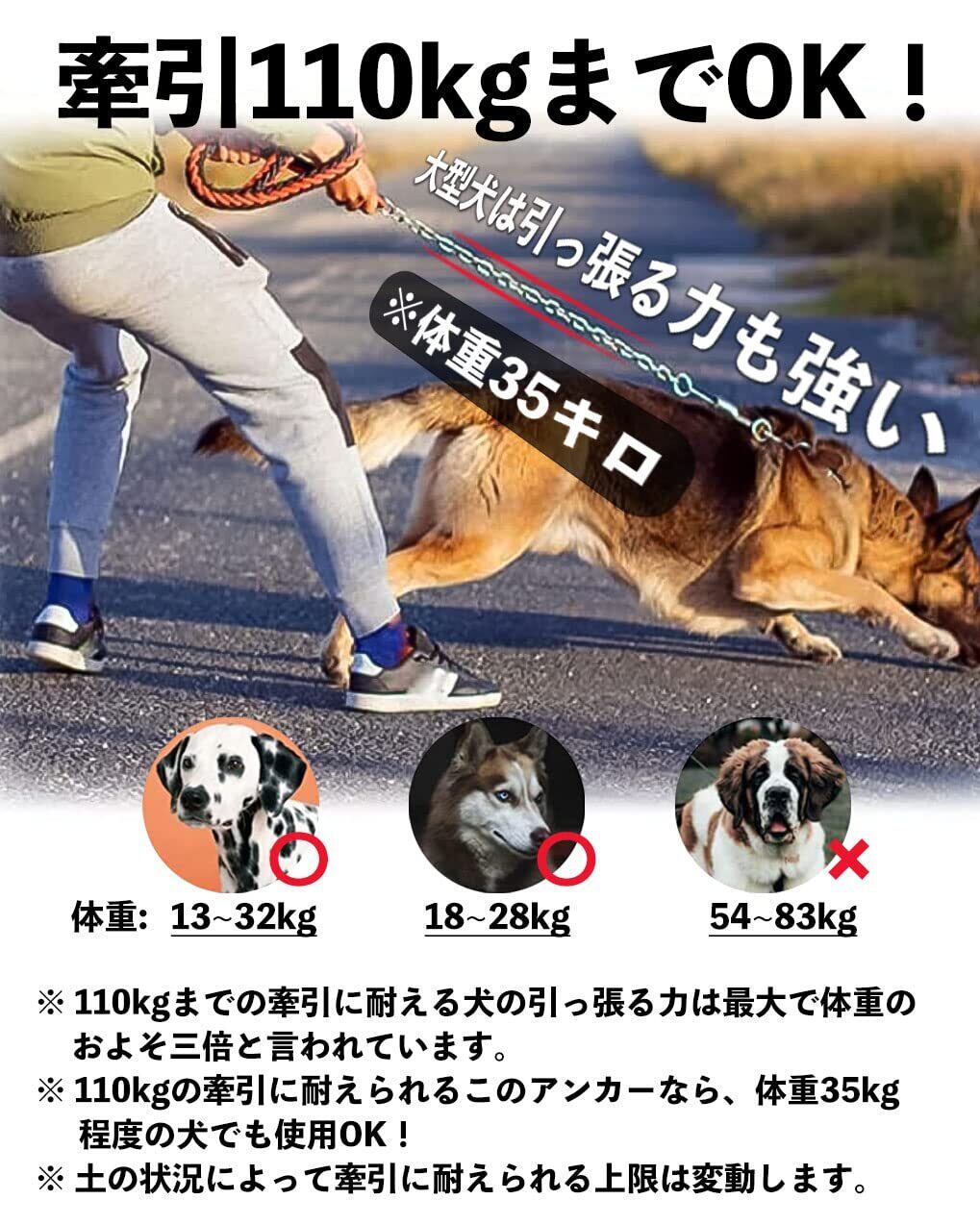 【耐重量性:】110kgの牽引に耐えられるこのアンカーなら、体重35kg程度の犬でも使用OK!(検証による値です。状況によって前後します。)【お知らせ】硬い芝生、硬い三和土、セメント畑で使うことができる。砂地・湿地帯での使用はお勧めできません。