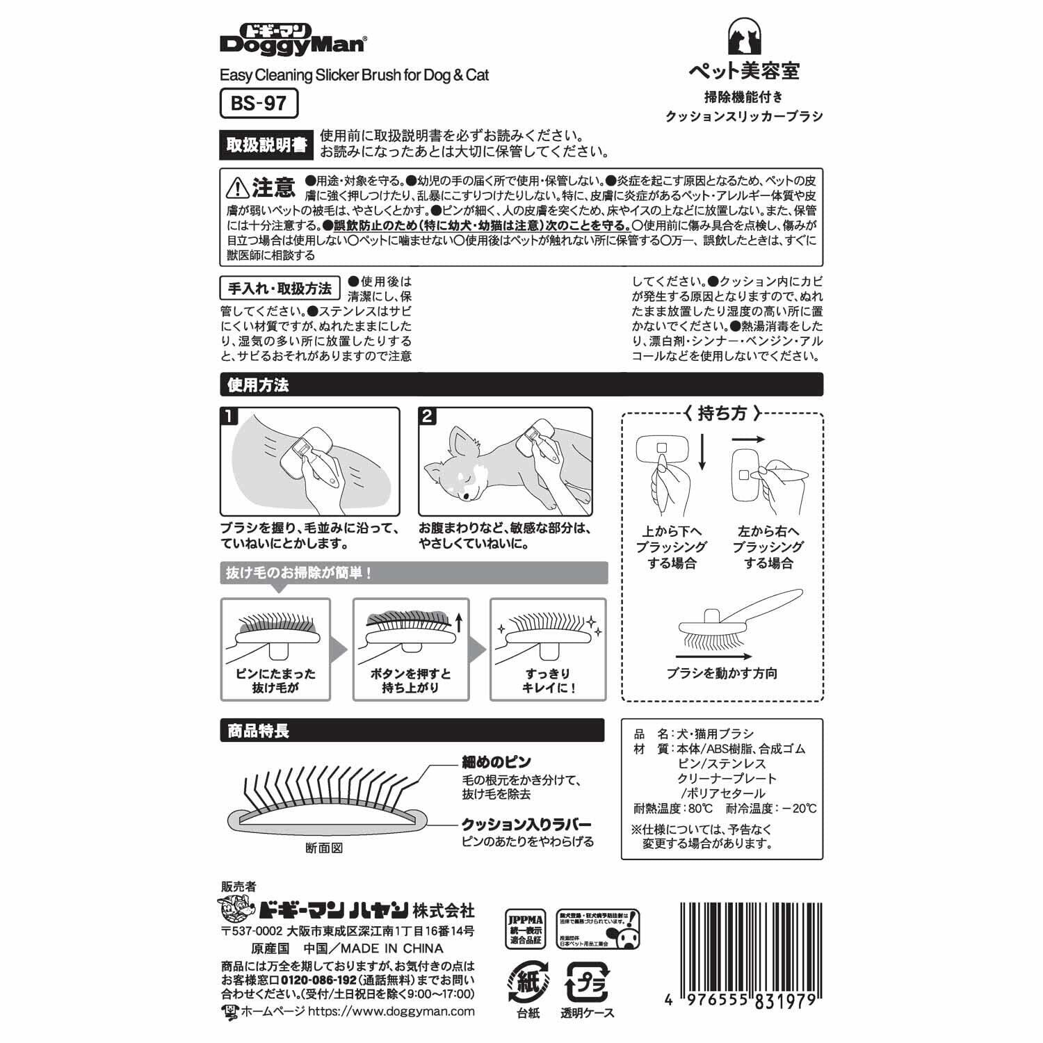 ●抜け毛をかき取り取れた抜け毛はワンプッシュ処理でお掃除簡単●細ピンが根元からムダ毛、抜け毛をかき出す。●取れたムダ毛や抜け毛はワンプッシュでブラシ掃除が簡単。●クッションラバーがピンのあたりをやわらげる。●ドギーマンのペット美容室。犬猫用。ラバーグリップ・抗菌。耐熱温度:80℃耐冷温度:-20℃。