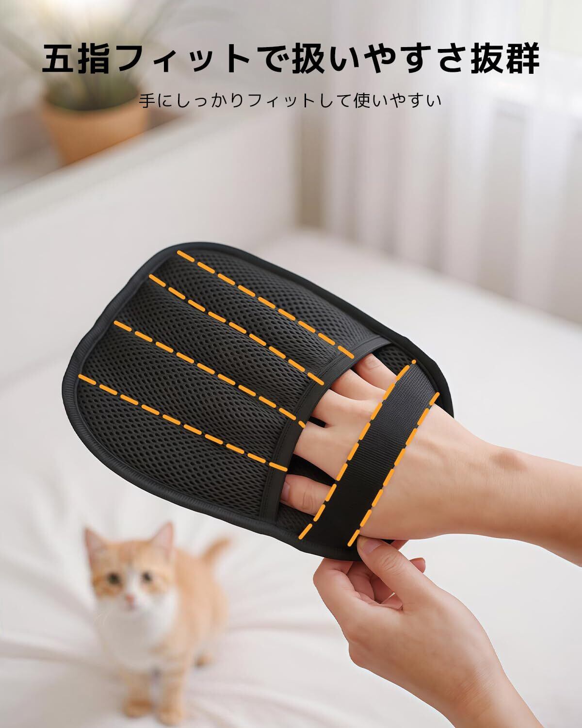 【五本指設計でフィット感抜群】左右両用の五本指タイプ。人間工学に基づいた設計で手に均一な圧力をかけ、疲れにくくブラッシングやお掃除が快適に。