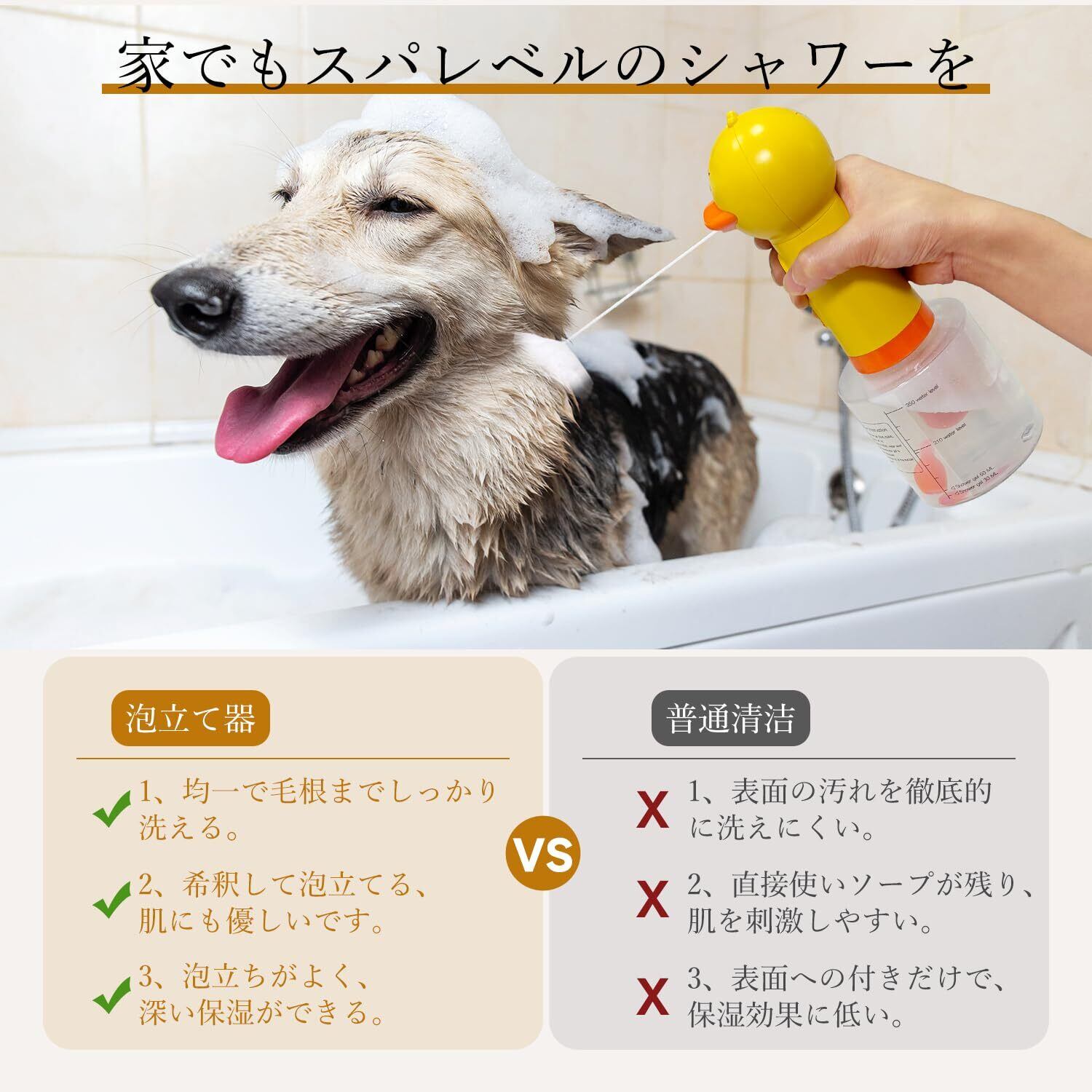 【400mlの大容量ボトル】:犬 シャンプー 泡立て器 ボトルは400mlの大容量ボトルがあり、頻繁にソープ液を入れる必要はありません。容量目盛り付の透明なボトルなので、残量がひと目でわかります。重力球付き、ボトルを傾けても泡の噴射を妨げません。※シャンプーと水の割合は1:6となります