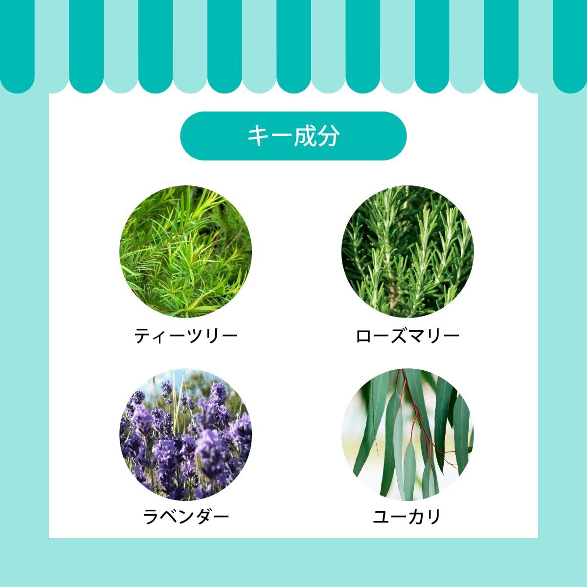 ティーツリーオイル、ユーカリオイル、ローズマリーオイル、シトロネラオイル、ラベンダーオイル、紫外線防止成分、ヘアコンディショニング成分、香料、保存料 など