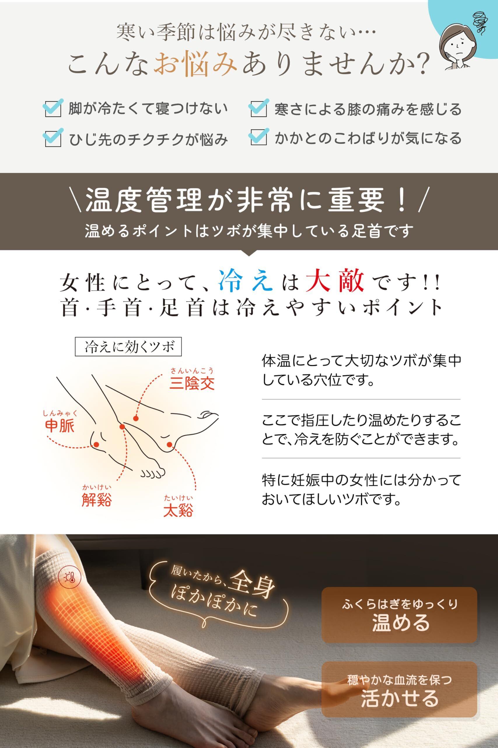 【足から全身へ・足湯のように】このレッグウォーマーは、足元から全身へじんわり温かさを感じられるよう設計されています。特に足首周辺の冷感ツボをやさしく温め、まるで足湯に浸っているかのようなリラックス体験をお届けいたします。短時間の着用で足首から身体全体がぽかぽかと暖まる心地よさを、ぜひお試しください。