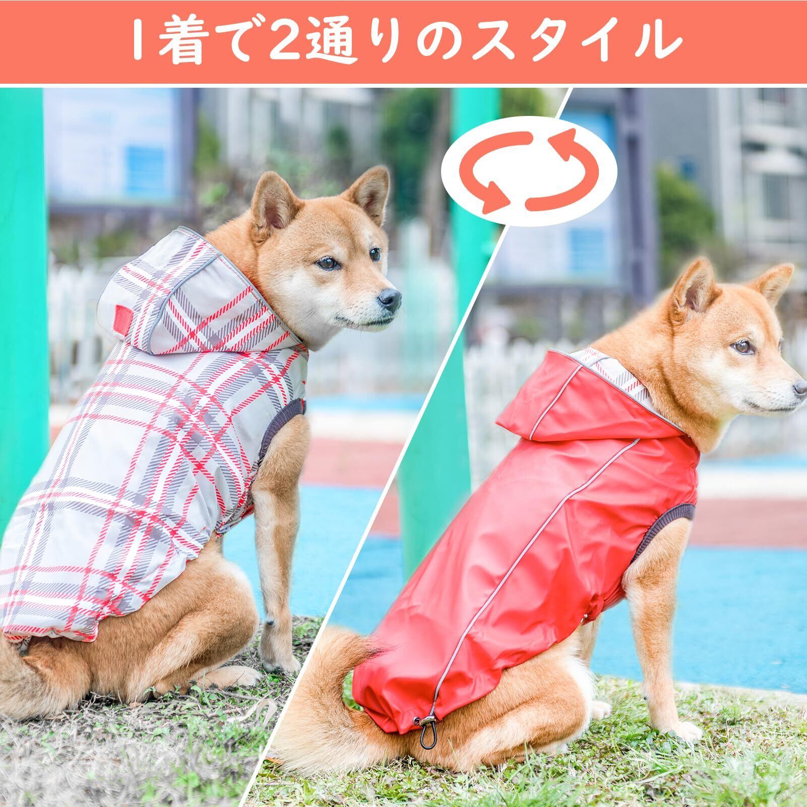 【防水&リバーシブルデザイン】:このオールシーズン対応の犬用レインコートは、防水加工が施された生地で作られており、雨や風から愛犬をしっかり守り、快適さと暖かさをキープします。リバーシブル仕様で、無地とチェック柄の両面を楽しめるため、愛犬のスタイルに合わせてお好みのデザインをお選びいただけます。