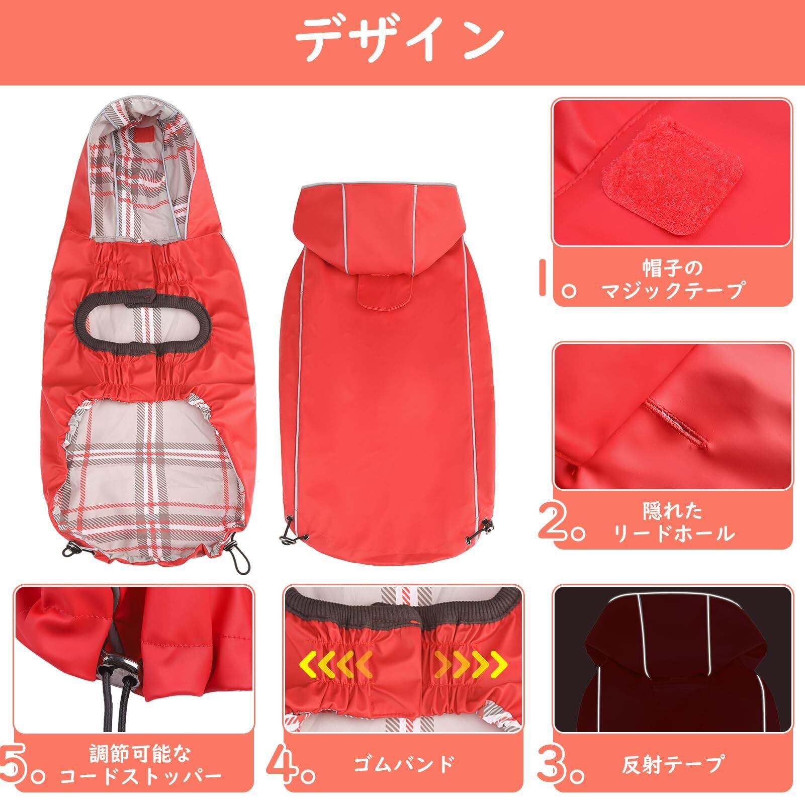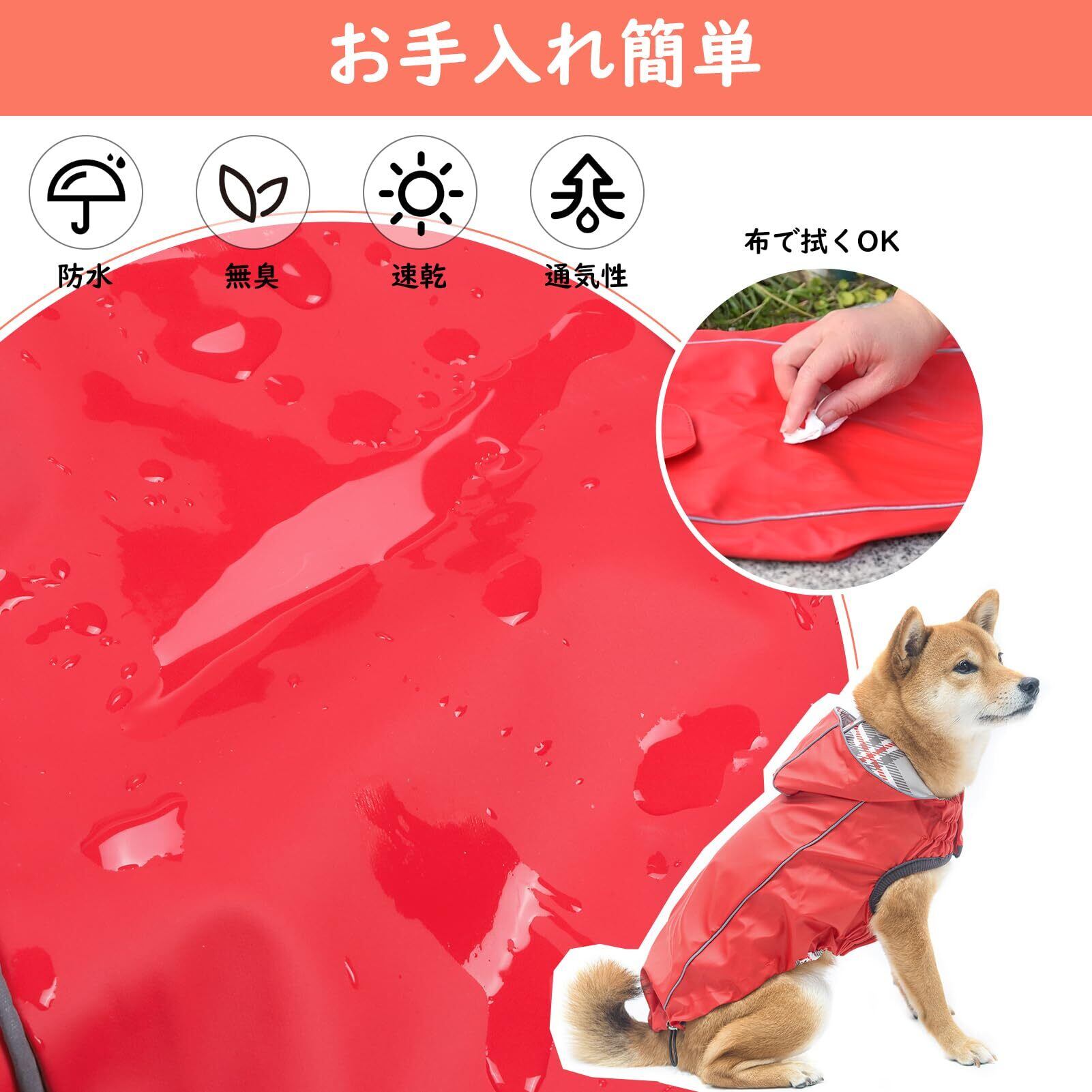 【反射素材&安全性】:鮮やかなレッドまたはオレンジからお選びいただけるこのレインコートには、全周に反射ストリップが付いており、雨の日や夜間、視界が悪い時でも安心してお散歩ができます。背中上部にはリード用の穴があり、ハーネスを使用する方にも便利です。