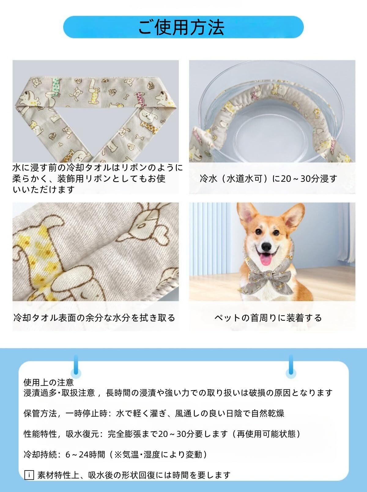【使用方法】アイスタオルを氷水に浸し、20~30分待って膨らみ、表面が乾いたらペットの首に巻くだけです。 染み込ませていないアイスタオルはリボンとして使用でき、可能、繰り返し使用でき、エコで経済的。