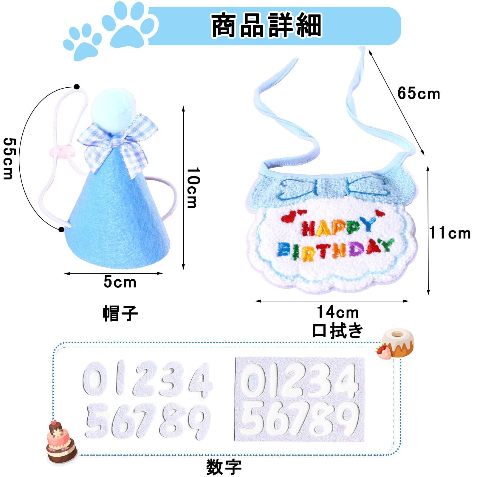 【3点セット】:帽子、よだれタオル、数字が含まれるセットです。帽子の高さ10cm、幅5cmです。よだれかけの幅14cm。犬や猫などのペット用商品です。