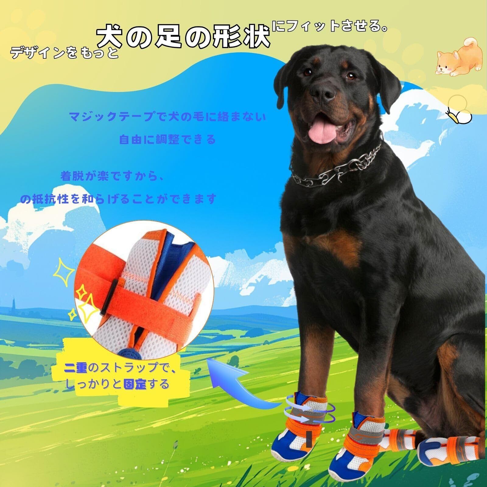 【軽量素材が軽やかな足元をサポート】 ナイロンウェテープは柔らかく快適です。高品質なベルクロを簡単に調整できる。履き口は日焼け止めと防塵を兼ねています。着せやすく、散歩中や動きまわったときに簡単に脱げない。手洗い可能です。