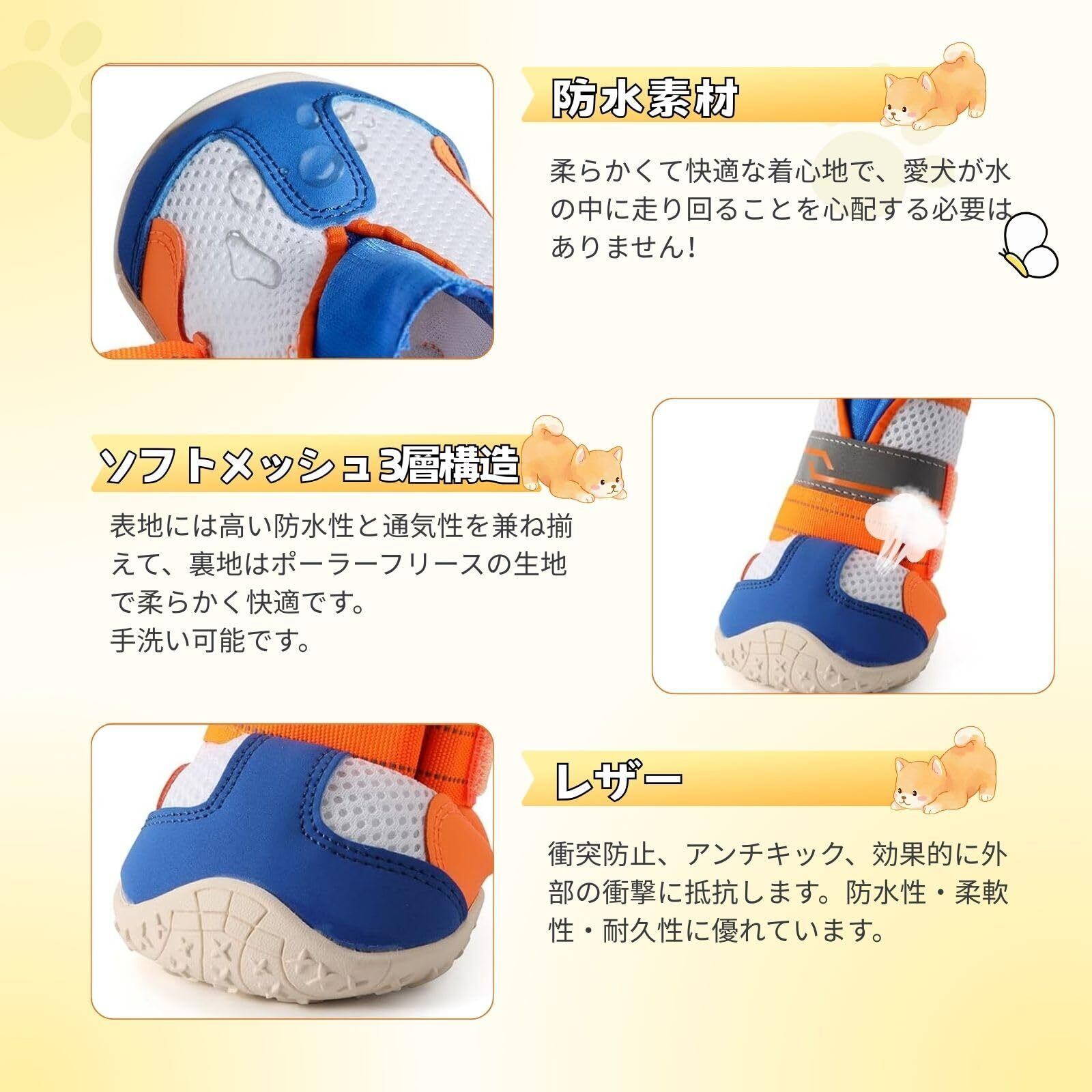 【ハイライト反射、安全性アップ】 ハイライト反射で、夜には光を反射する安全にも気を付けられている。メッシュで軽いことと、ぐにゃぐにゃ曲がる靴底が特徴で、ワンちゃんは何も履いていないかのように使う。