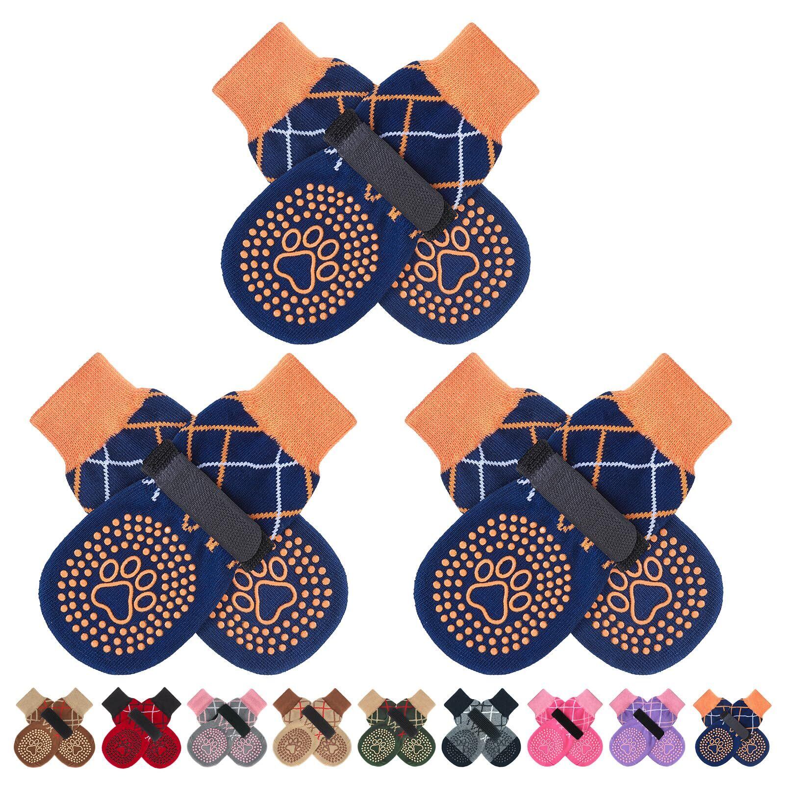 BINGPET 犬 靴下 犬用靴下 滑り止め 足保護 6個セット 肉球保護 犬の靴下 柔らかい 脱げない ペットソックス かわいい犬の足跡 防寒 転倒防止 秋冬 屋内用 通気性 介護 老犬 サポート 足舐め防止 かわいい おしゃれ 小型犬 中型犬 大型犬 シニア犬用 (紺色、S)