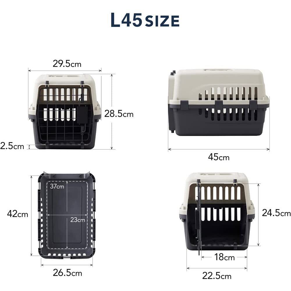 L45サイズ(約):【外寸】幅29.5×奥45×高28.5cm【内寸】幅26.5×奥42×高26.5cm【底面積】幅23×奥37cm【入口】幅18×高24.5cm ●重量(約):1.2kg ●耐荷重(約):~5kg ●材質:【ケージ】ポリプロピレン【ドア】スチール ●カラー:クールグレー/ライトブルー/ダークブルー ●生産国:中国(企画・デザイン:中国) ●メーカー:株式会社オーエフティー