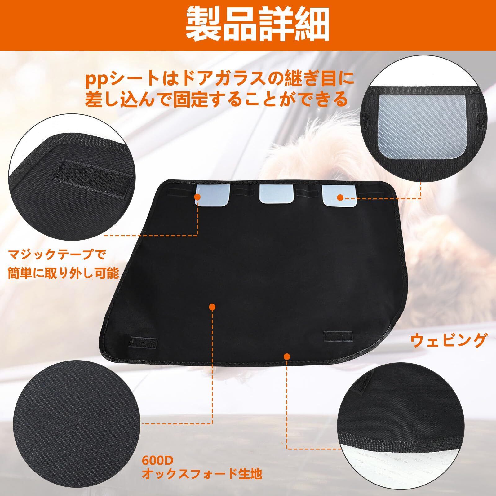 【装着簡単】1.ドアカバーをドアに当て、取り付け位置を確認します。2.マジックテープをドアカバーの対応する位置に付けます。3.インサートプレートを車の窓の間に取り付けます。4.マジックテープの粘着部分をはがし、ドアにしっかりと貼り付けます。