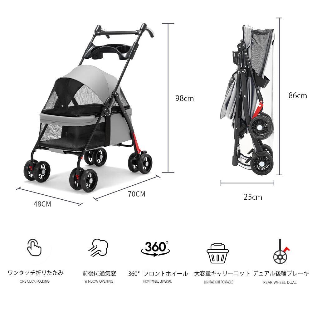 JINETES ペットカート 犬 4輪 犬用カート バギー 小型/中型犬 猫 組み立て簡単 ワンタッチ折り畳み コンパクト收纳 軽量 前輪360°回転 後輪ブレーキ付 耐荷重18KG 外出便利