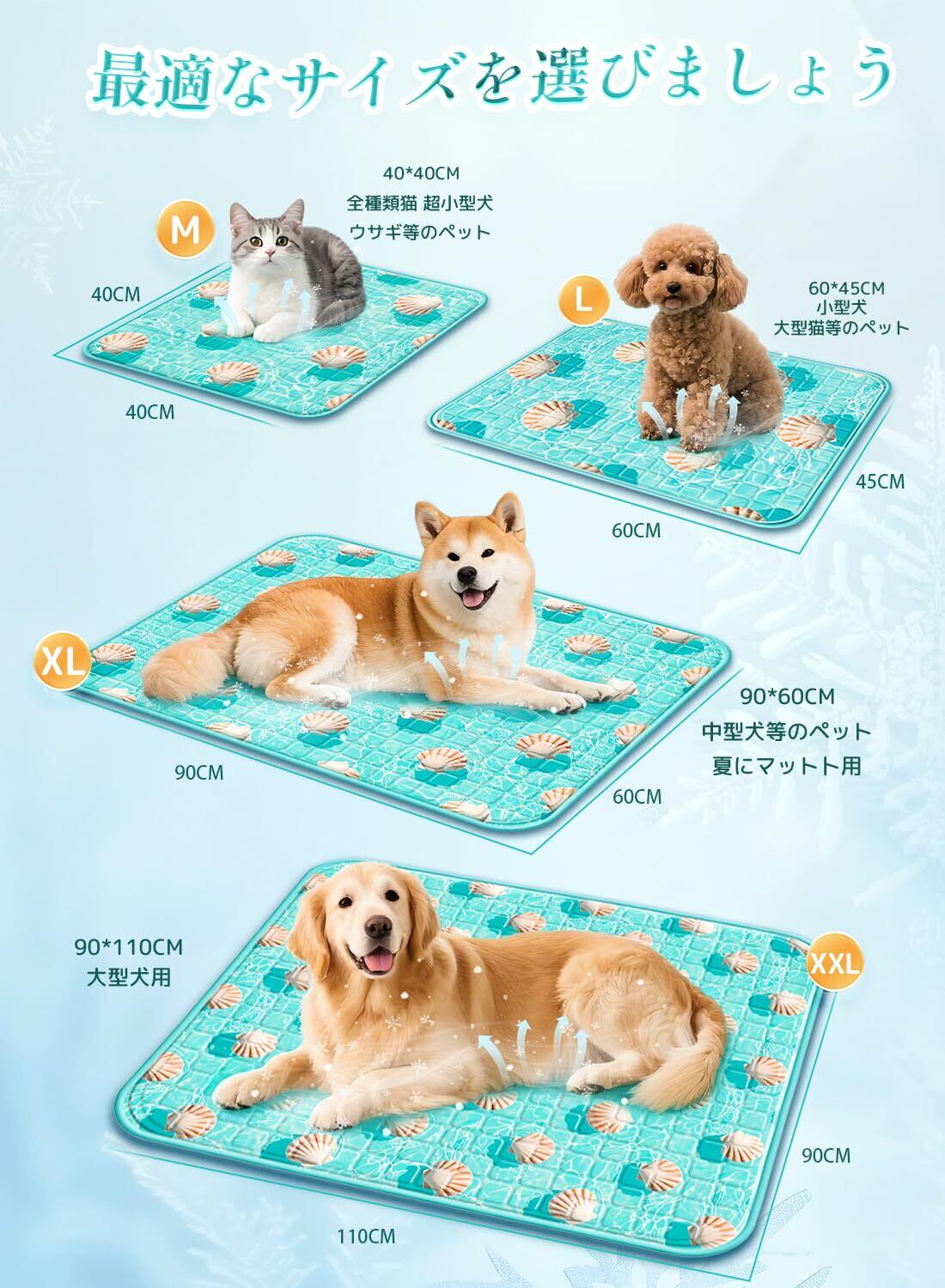 Yalfero ペットひんやりマット犬 猫 夏用 クールマット 冷却マット 冷感マット 【防水防漏対策 冷感水ジェル】 持続冷感 接触冷感 暑さ熱中症対策 抗菌 滑り止め 洗える 折りたたみ ペット人間兼用 多用途 猫 小型犬対応 60x45cm 青い波紋貝殻デザイン