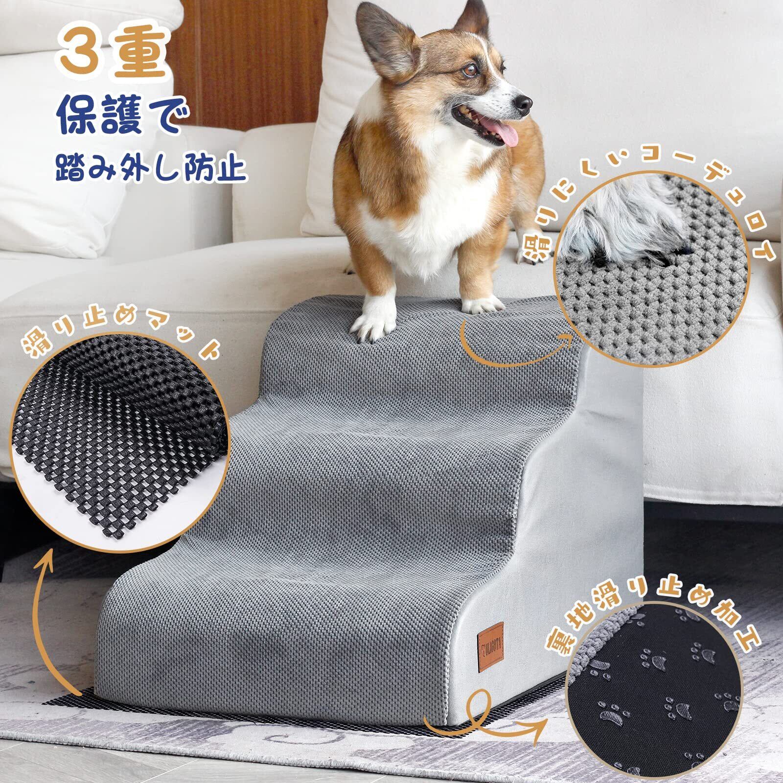 犬用ステップ 3段 ドッグステップ 犬用スロープ 犬用踏み台 犬用階段 小型犬 室内犬 高齢犬 滑り止めマット付き カバー取り外し 洗える 手持ち付き(グレー)