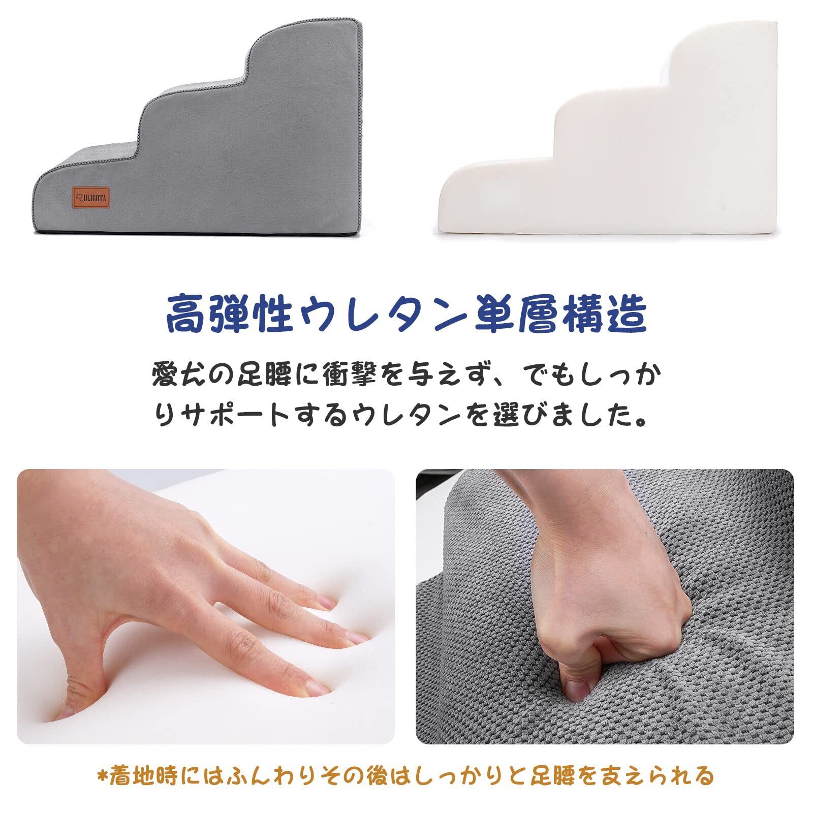 ペットの段差の上り下りをサポートするステップです。ゆるやかな傾斜で足が短い犬猫・小さい犬猫やシニアにもやさしい。クッション性の高いウレタンを採用、愛犬の腰に負担をかけず、楽に登ることができます!チップウレタンとは違い、接着剤を使用していないので、匂いに敏感なワンちゃんにやさしいウレタンです。