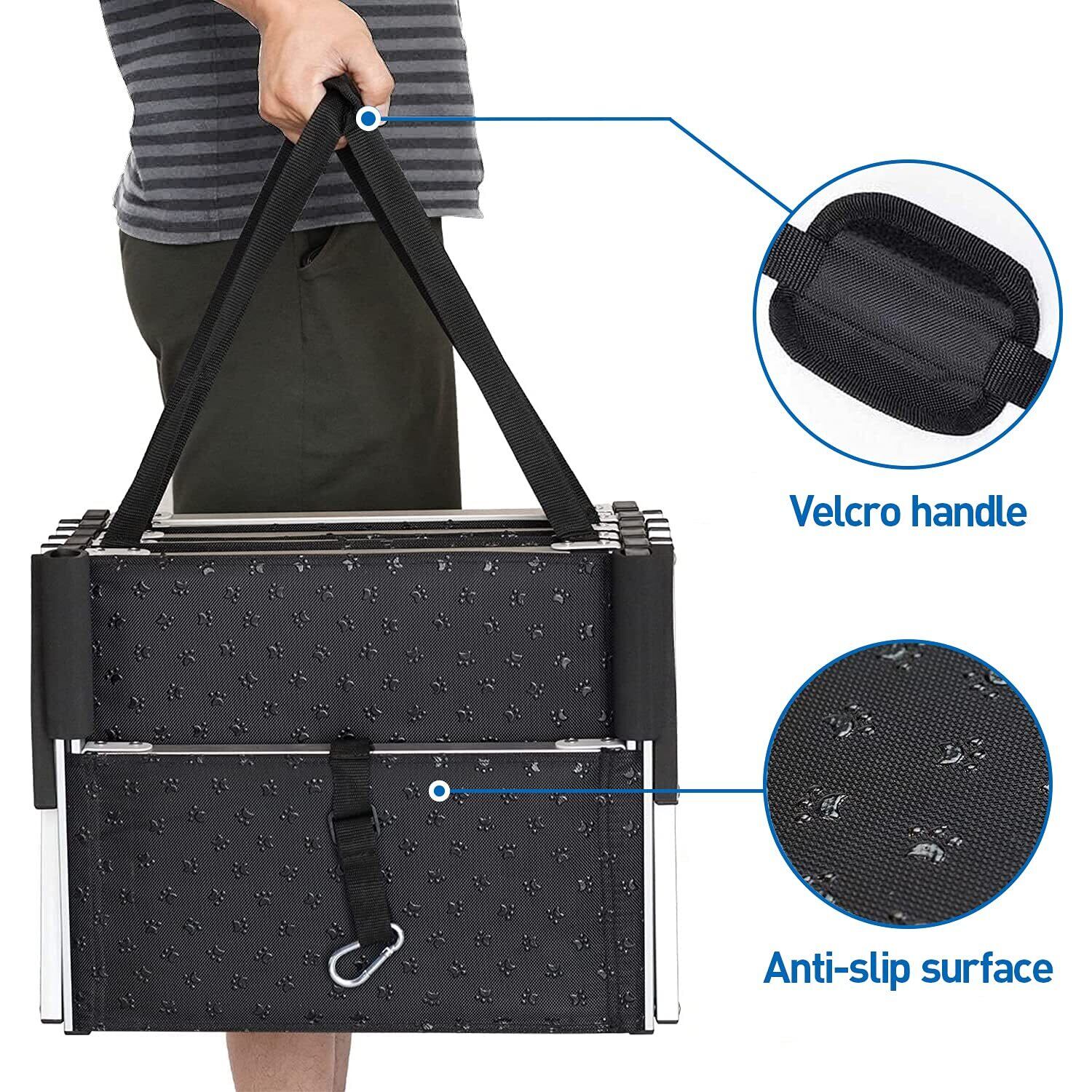 「頑丈な材料」犬用スロープは高品質のオックスフォード生地でできており、耐久性が抜群です。堅固な金属フレームは使用中の階段の安定性を確保できます、揺れ曲がりなくて、大きい犬でも安全に楽に歩けます。