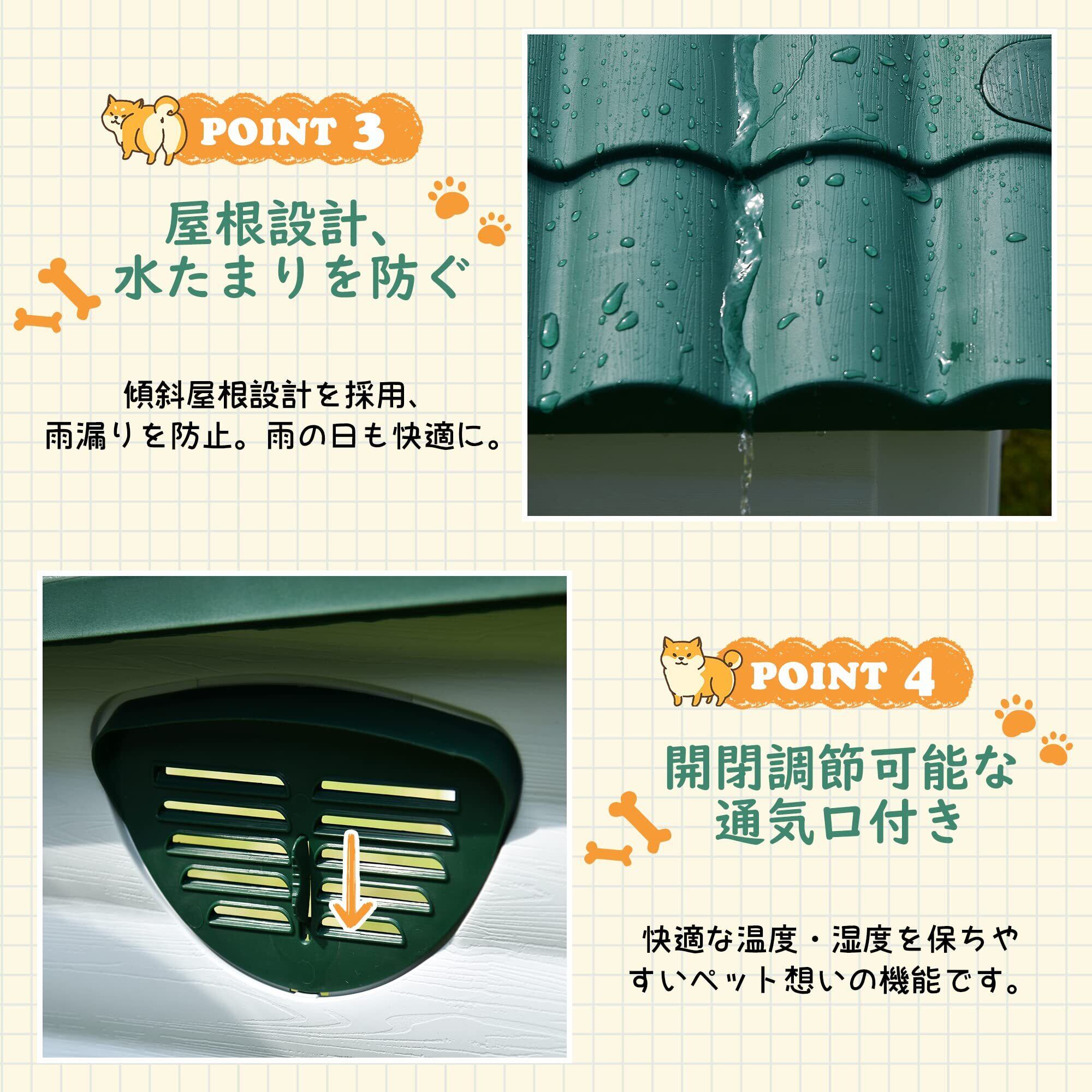 BTM 犬小屋 屋外用 犬舎 室外 中型犬用 大型犬用 ドア付き プラスチック製 ペットハウス オールシーズン 通気 日焼け対策 雨除け 水洗い 裏庭 室内 さびない 頑丈 グリーン