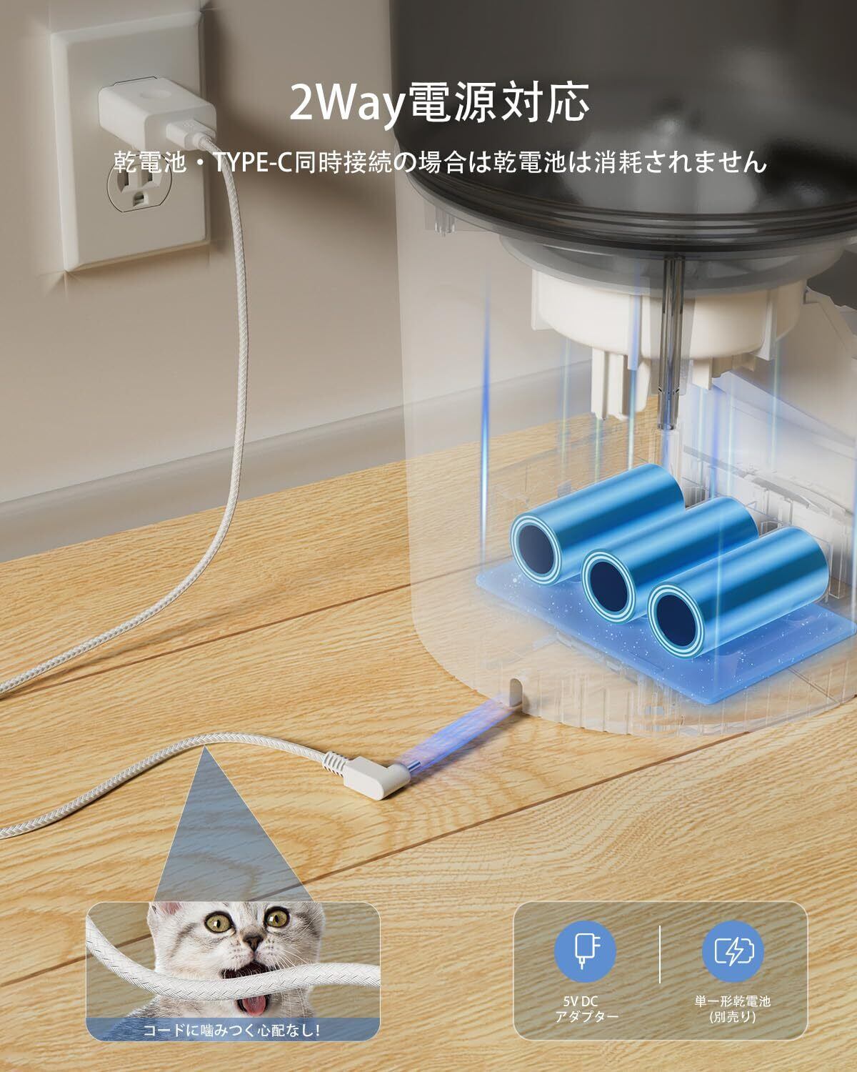 【2WAY電源 & 停電対策で365日安定稼働】AC電源+単1電池3本(別売)のダブル給電を搭載。災害時も給餌設定を記憶。