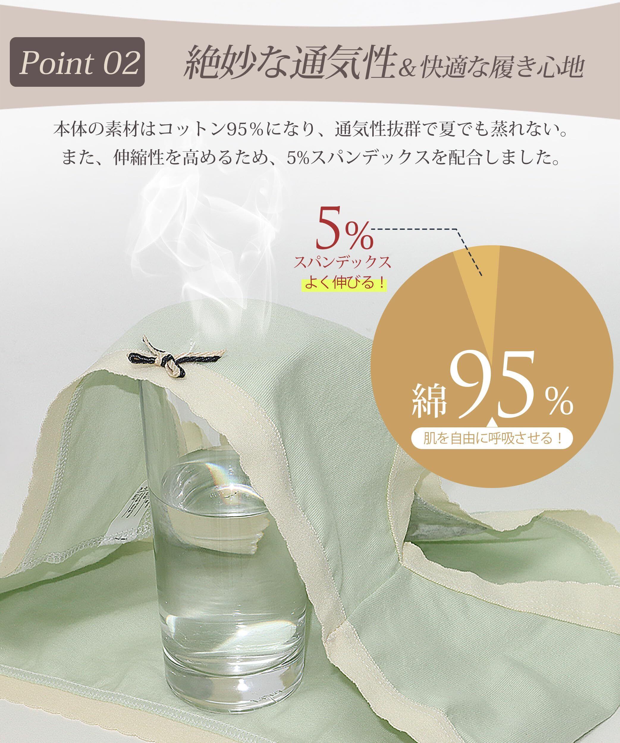 【 抗菌防臭100%綿素材&吸湿速乾 】 ショーツは女性のデリケートな部分を衛生的に保つことを主要目的とする下着なので、抗菌防臭機能は大切です。SLEEPSINEROのショーツレディースは本体に「吸湿性・放湿性・通気性に優れた95%コットン」を採用したため、汗などの水分をすぐに吸収し、発散してくれます。ショーツのクロッチ部分は「100%天然コットン」を採用しております!それにより、綿ショーツは繊維上の汗や汚れを栄養源とする細菌の増殖を抑え、臭いの原因菌を抑制することで嫌なニオイを防いぐことができます!
