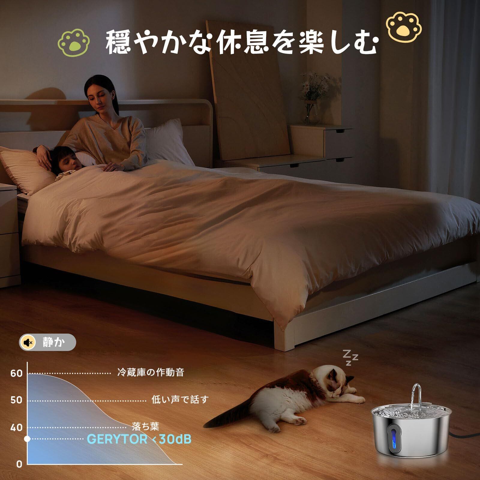【猫の健康は水から|清潔な飲み水を維持する給水器】GERYTORが最新の市場調査をもとに開発したプレミアムステンレス猫 みずのみ器は、従来品の3大課題「フィルター材質の劣化による水の粘つき」「タンクの粗悪な材質」「騒音の大きいポンプ」を徹底的に改善。当社が独自開発した6層複合フィルター(銀イオン技術採用)は精密ろ過機能を備え、水の粘つきを防ぎ、常に清潔でサラサラな水質を維持。さらに食品グレードSUS304ステンレス製タンクには特殊加工を施し、汚れの付着を抑制して猫の顎周りを衛生的に保つ設計を実現。加えて深夜でも気にならない静音設計の長寿命ポンプを採用し、愛猫の快適な飲水環境をトータルでサポートしています。
