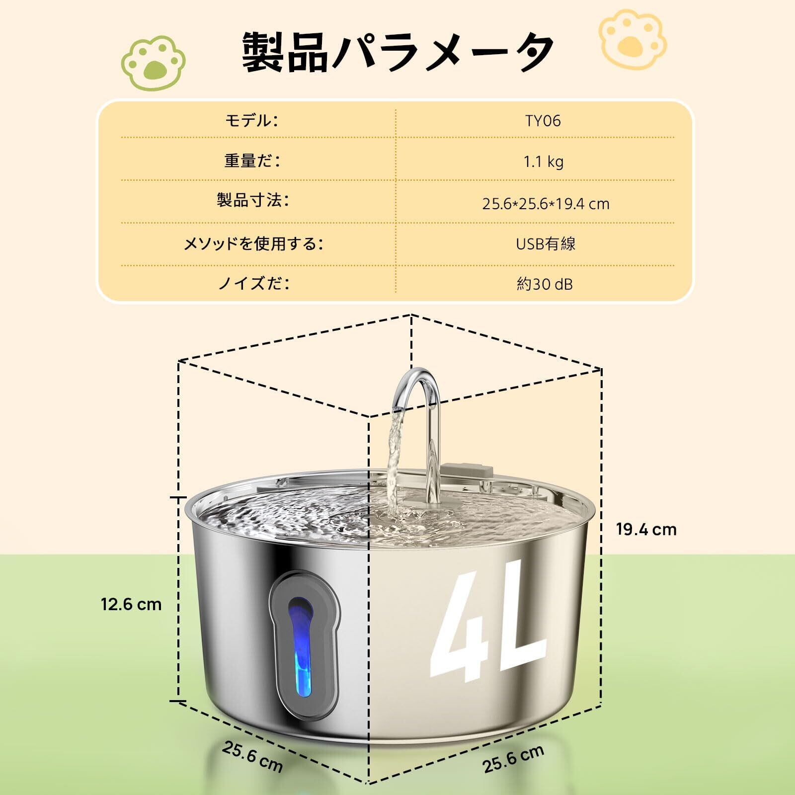 【4L大容量×プロ仕様衛生管理】猫・犬対応給水器は、猫5kg~犬10kgまで最長2週間の給水を可能にする4Lタンクを搭載。完全分解可能なプロユース設計で、70℃食洗機洗浄にも対応。銀イオンフィルター(2~3週間交換)と専用スポンジフィルター(1ヶ月ごと交換)のデュアル交換システムを採用。週1回のポンプ簡易洗浄と月1回のポンプ本格洗浄を推奨いたします。特にポンプ内部の洗浄を定期的に行うことで、多頭飼い環境でも常に清潔な飲み水を維持できます。