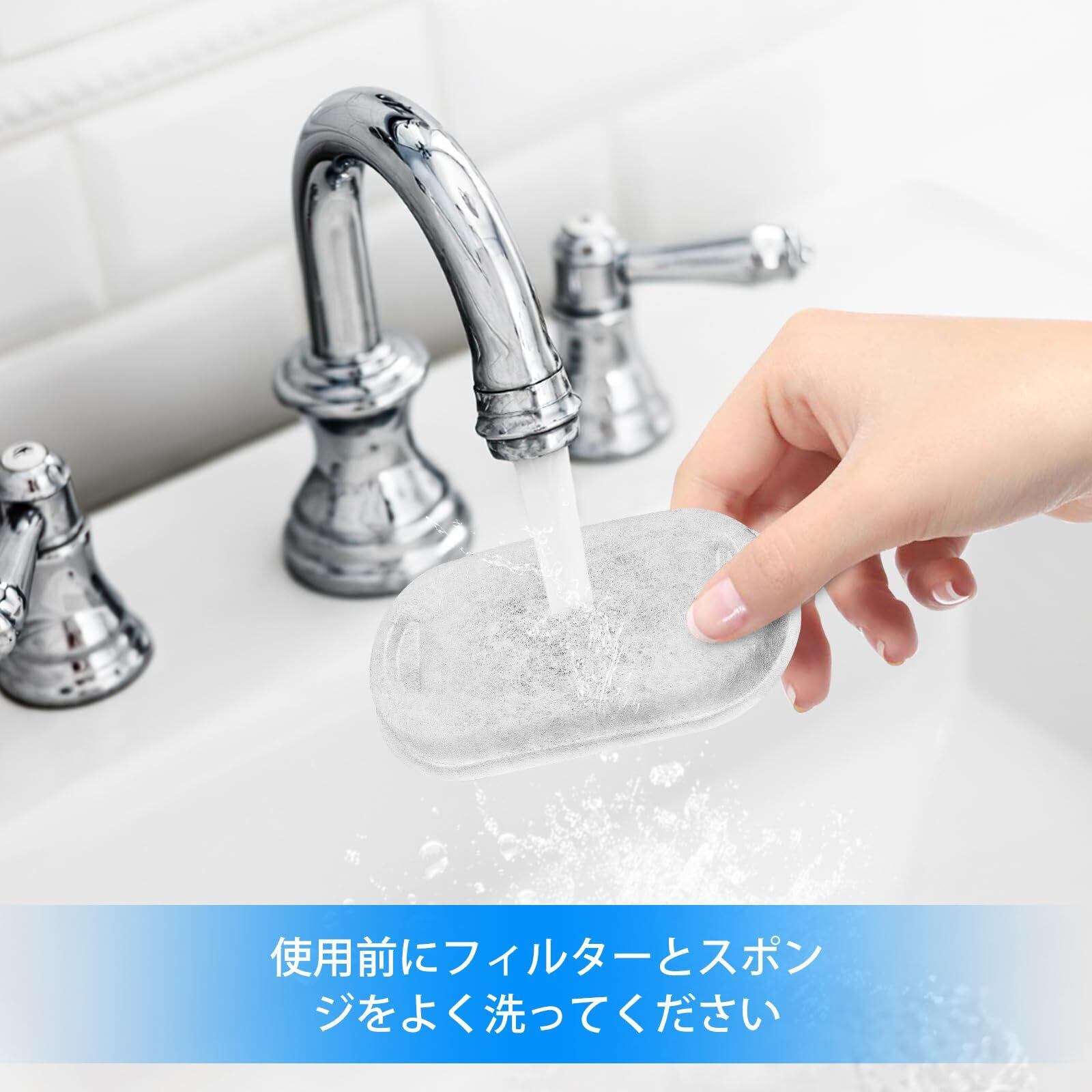 お手入れ:フィルターのお手入れは、表面の汚れを水で洗い流し、洗剤は使用しないでください。フィルターを交換する際は、給水器本体の隅々まで清掃し、清潔に保ってください。特に夏場は虫が発生する可能性があるので、給水器やフィルターを3日に1回洗浄し、水を交換することをおすすめします