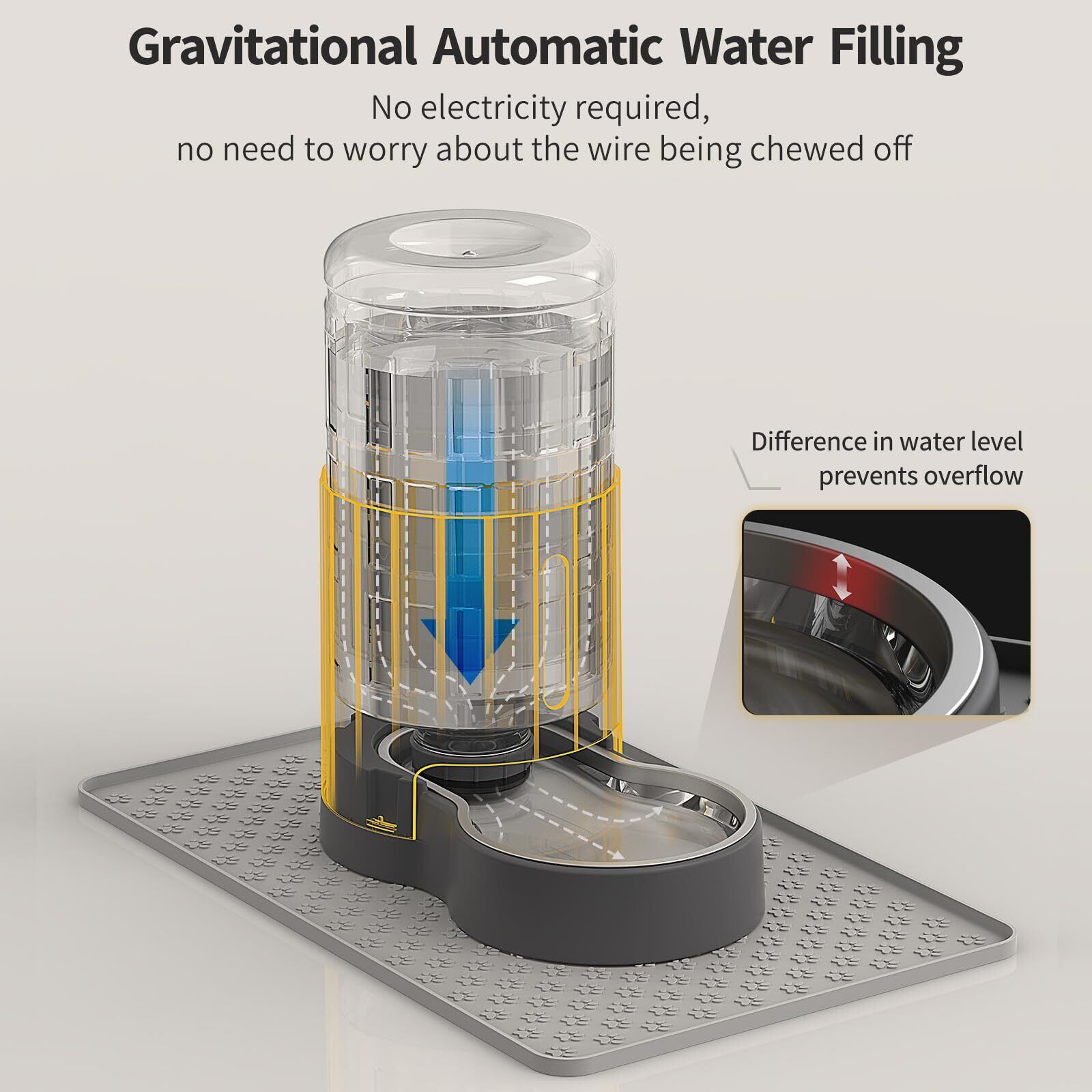 重力式自動補充&水漏れなし - このペット用給水器は、重力を利用して自分で水を入れるので、電気が必要なく、コードを噛まれる心配がありません。猫用重力式給水器は、底部の水が一定の高さに達すると、溢れるのを防ぐために自動的に水の注入を停止します。
